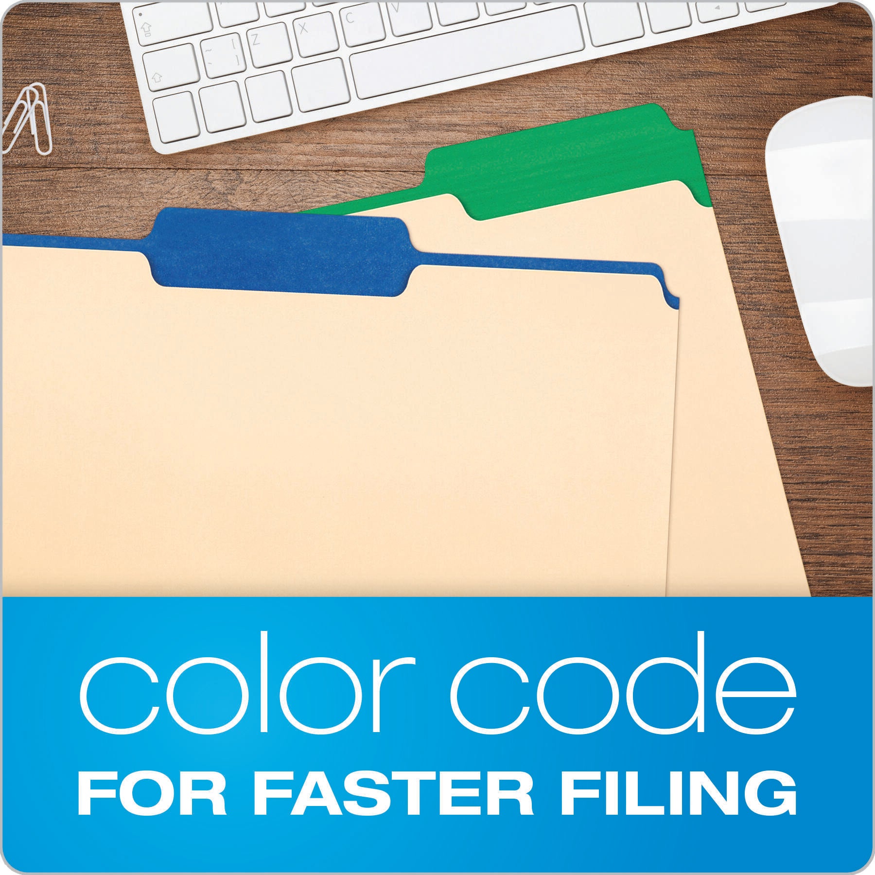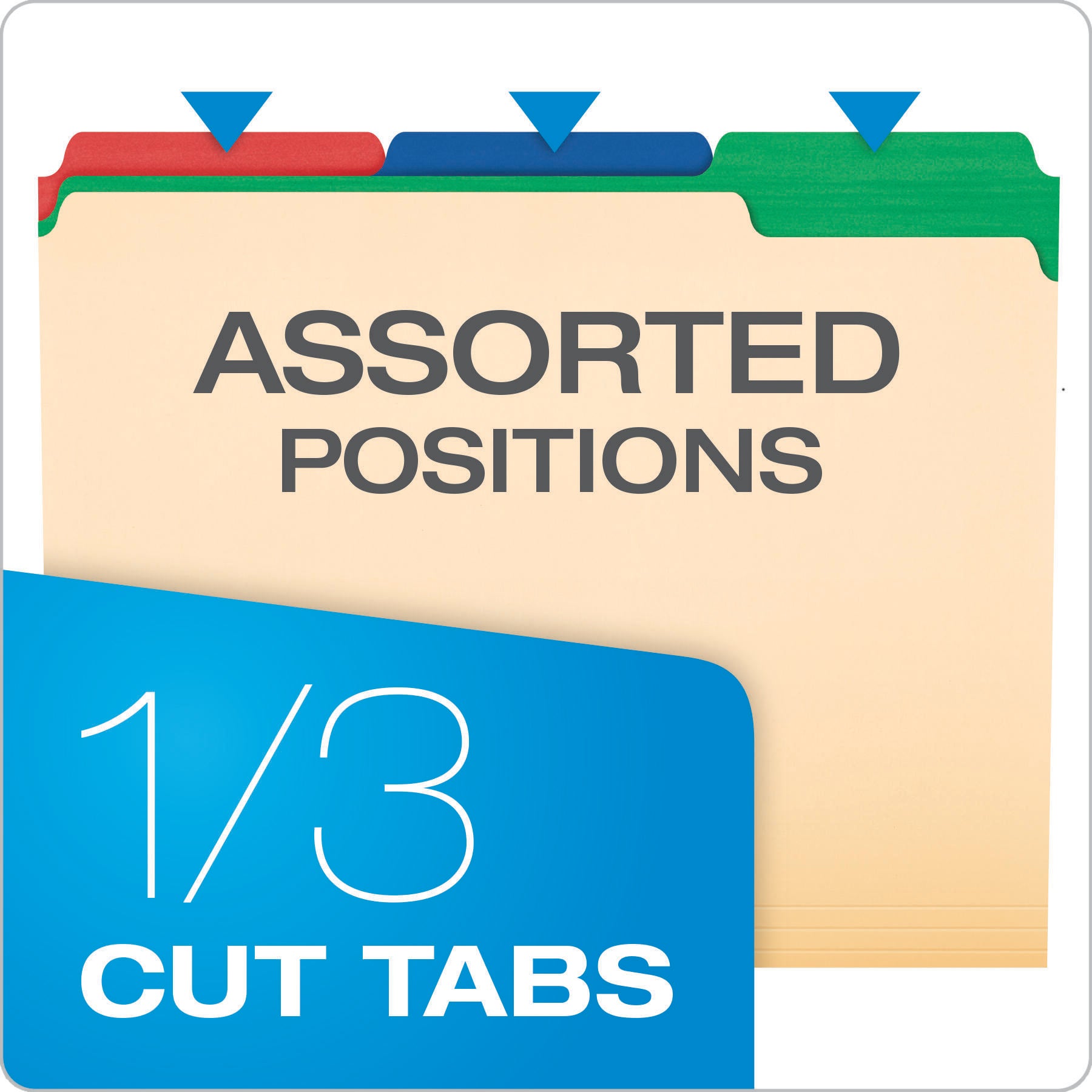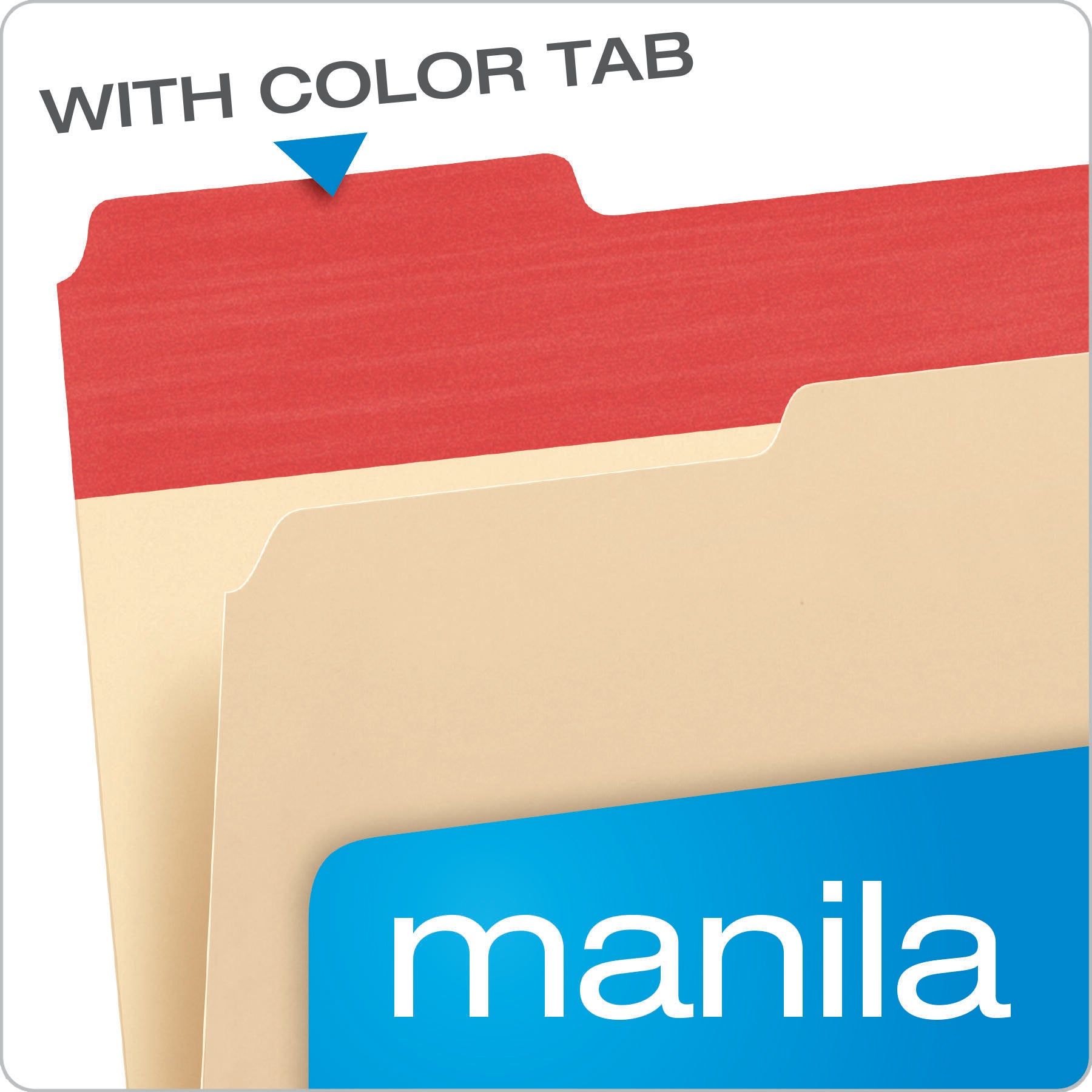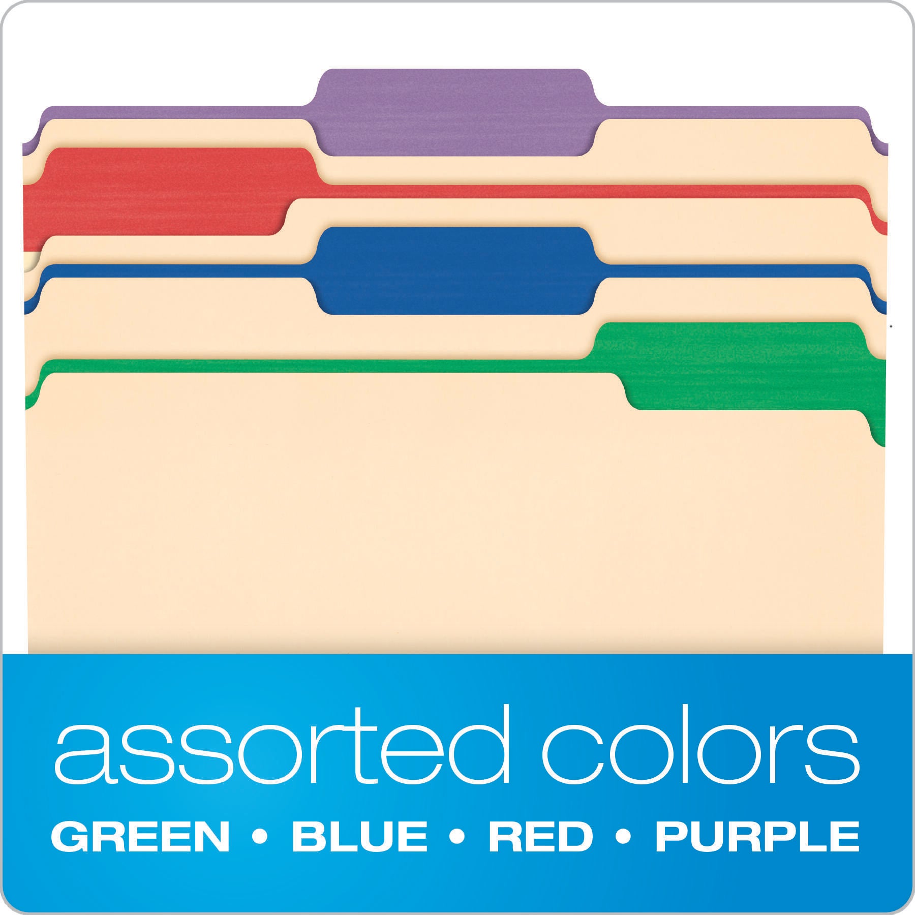 Manila file folders feature exclusive colored tabs. Design makes it easier to find files and adds a colorful flair to your desktop organization system. Prevent misfiles in any filing system with color tabs. Tabs are 1/3 cut in assorted positions and come in blue, red, green and violet. Letter-size folders are made of durable, acid-free, 11 point stock. Colors include violet, red, green, and blue.