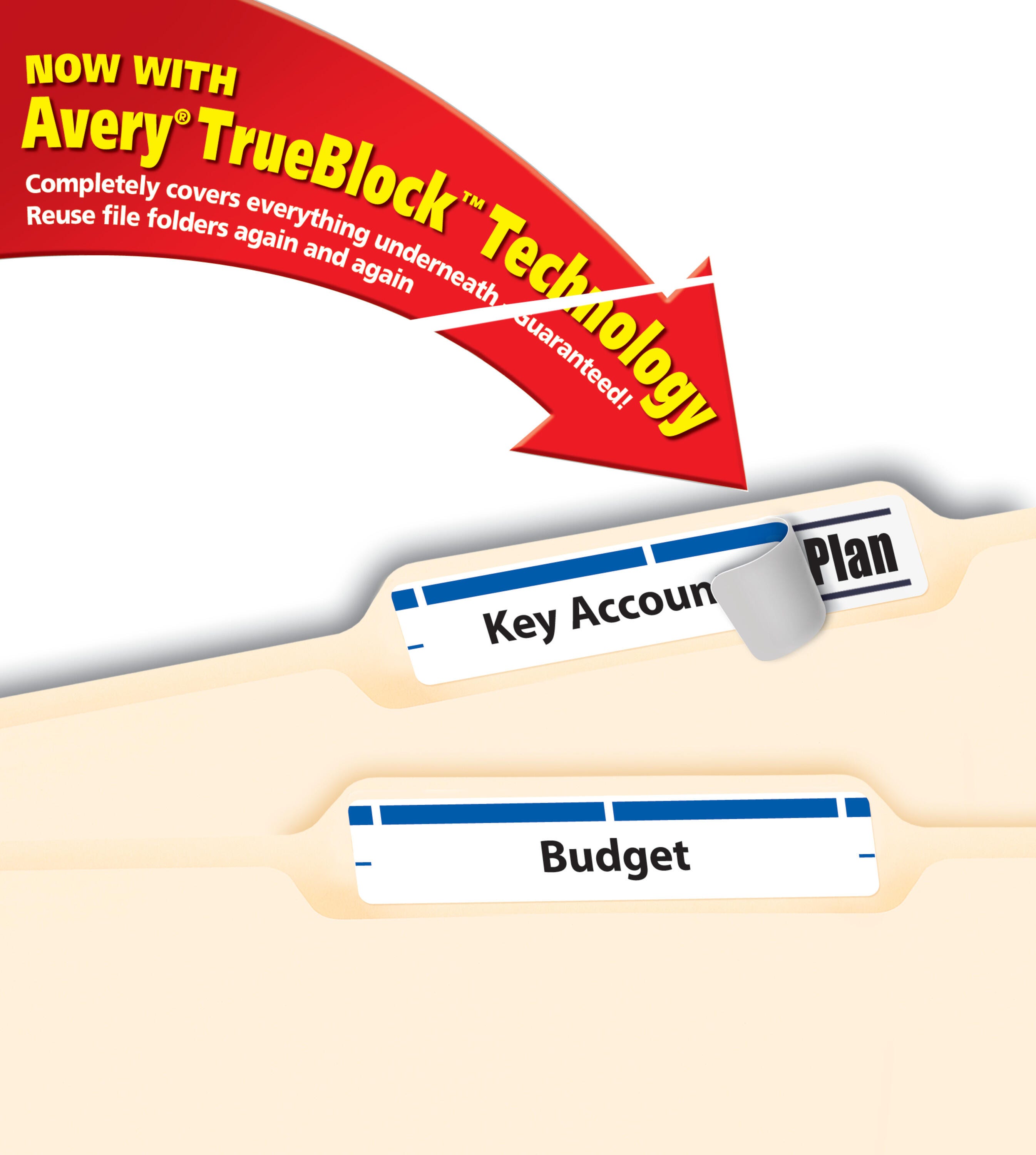 Create professional-looking file folder labels for easy and quick file identification. Labels with TrueBlock completely cover everything underneath so you can reuse mailing tubes, boxes and more. Labels have permanent adhesive that sticks without lift or curl. Each sheet of labels is acid-free, jam-free and smudge-free. Each sheet has labels sized to fit 1/3-cut tabs. File folder labels are compatible with inkjet and laser printers.