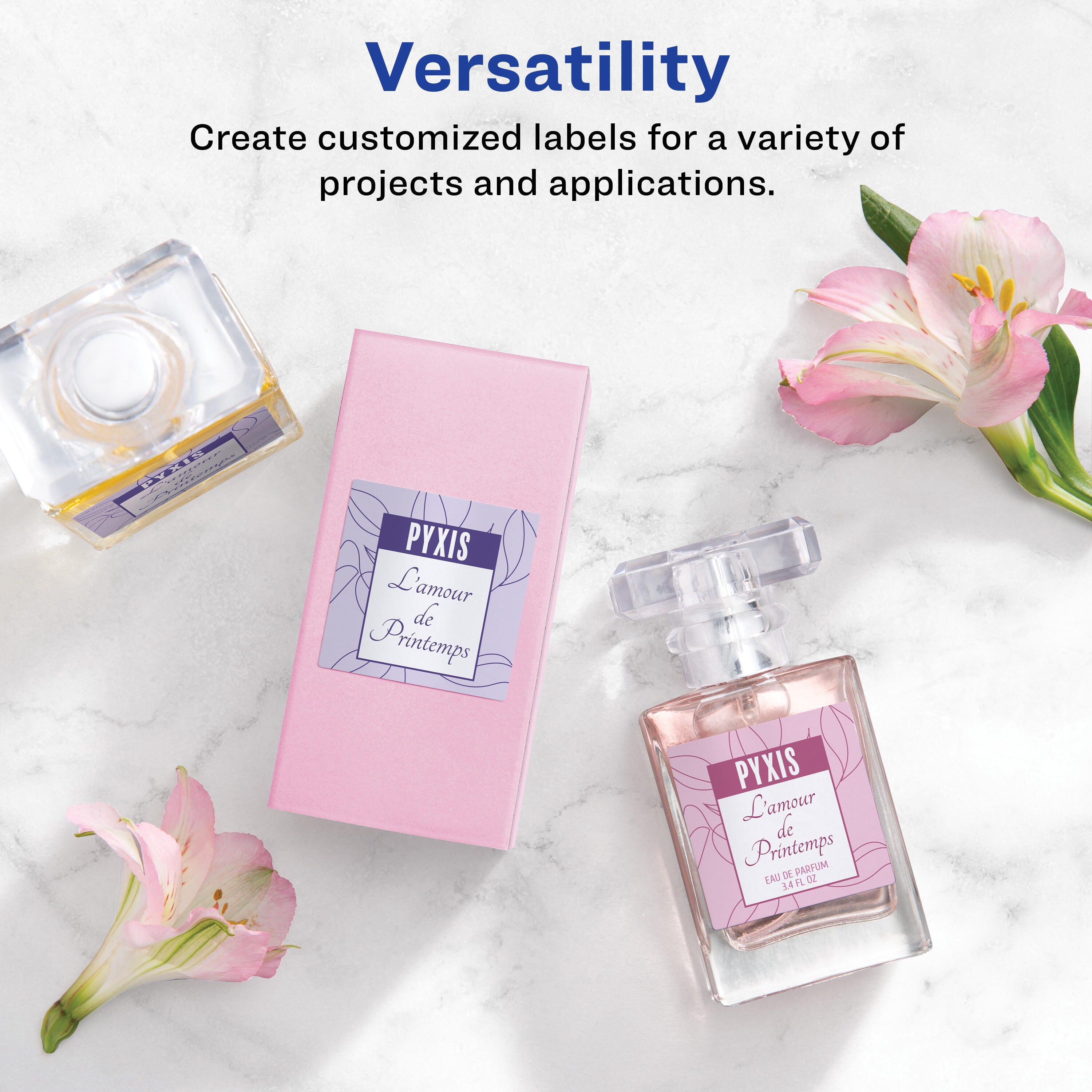 Easy Peel White Square Labels are ideal for branding, promotional items, packaging, mailings, brochures and other business products. These small square labels can be customized to promote your company or product, or connect customers to your website and other digital media with a 2D bar code or QR Code. Print-to-the-edge feature lets you add a full-color background to your brand logo, product name, address or message. Patented Easy Peel label sheets with Pop-up Edge ensure a quick and easy application. Simply bend the label sheet back, peel and return the sheet to a flat position. With room to print a bar code and one line of text, you can drive customers to your website, social networking feeds, video content, a map of your location or other information. Patent-pending TrueBlock Technology blocks out words or other dark colors underneath the label to provide more accurate bar-code scans, while completely covering the surface below. Labels are compatible with laser and inkjet printers.
