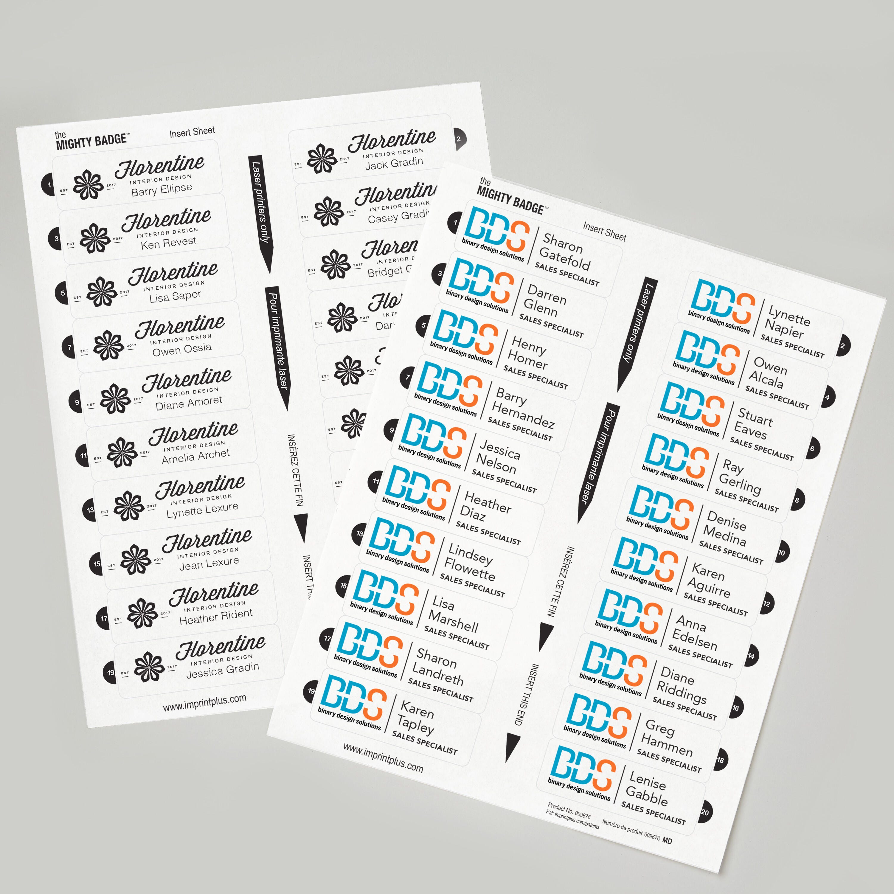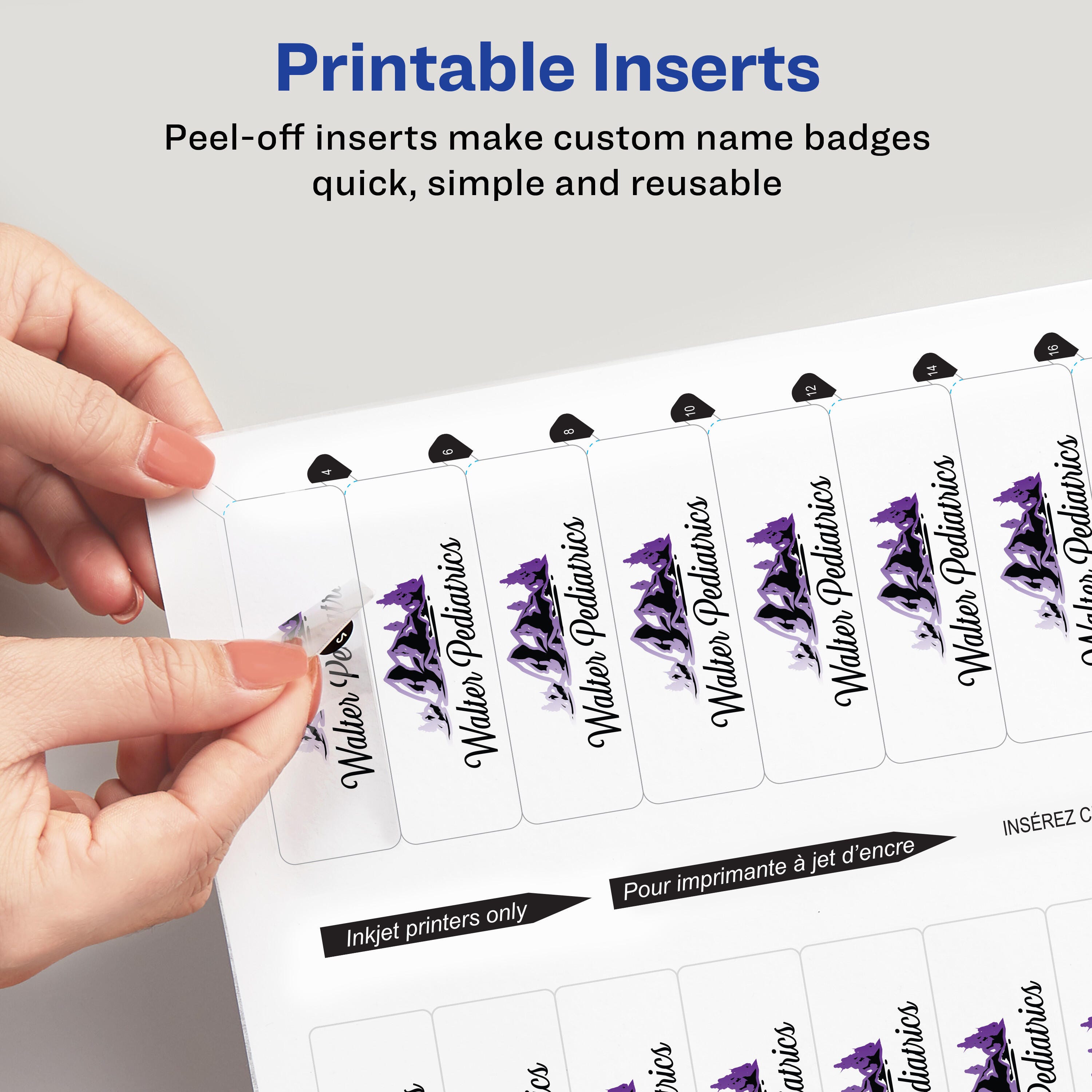 Create additional name badges for the Mighty Badge by Avery Professional Reusable Name Badge System with these customizable insert sheets. This refill pack includes five crystal-clear insert sheets with 20 inserts on each sheet for a total of 100 translucent inserts. Simply personalize the insert, print on a laser printer and replace to create a new custom ID badge. Insert sheets can be fed through the printer multiple times so you can print individual inserts as needed or the entire sheet at once. Nonadhesive inserts are easy to peel off from the sheet. The 1" x 3" personalized name badges (sold separately) are easy to assemble. Pack of 100.