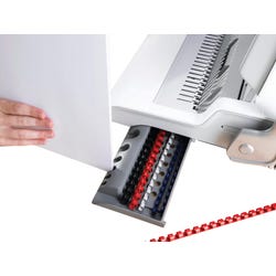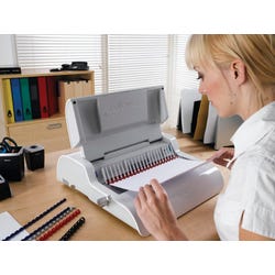 Electric comb binding machine offers effortless electric operation. Simply push the button to punch. It punches up to 20 sheets at a time and binds up to 300 sheets with a 1-1/2 inch comb. It allows you to punch and bind continuously for maximum productivity. Compact design makes it ideal for small to mid-sized offices. Vertical document-loading ensures accurate punch alignment. Adjustable edge guide centers documents with ease. Built-in comb storage tray includes a document thickness guide for added convenience and help with selecting the proper comb width. Binding machine includes a binding starter pack.