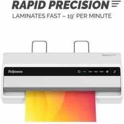 Fellowes Saturn 3i 95 Laminator accommodate documents up to 9-1/2 W inches. Hot laminates 3 mil or 5 mil thick sheets. Cold setting for self-adhesive pouches. Auto shutoff option saves power and prevents overheating. Green light and beep indicates that the machine is ready to laminate. The release lever allows for easy re-centering or removal of pouches. Includes starter kit.Features