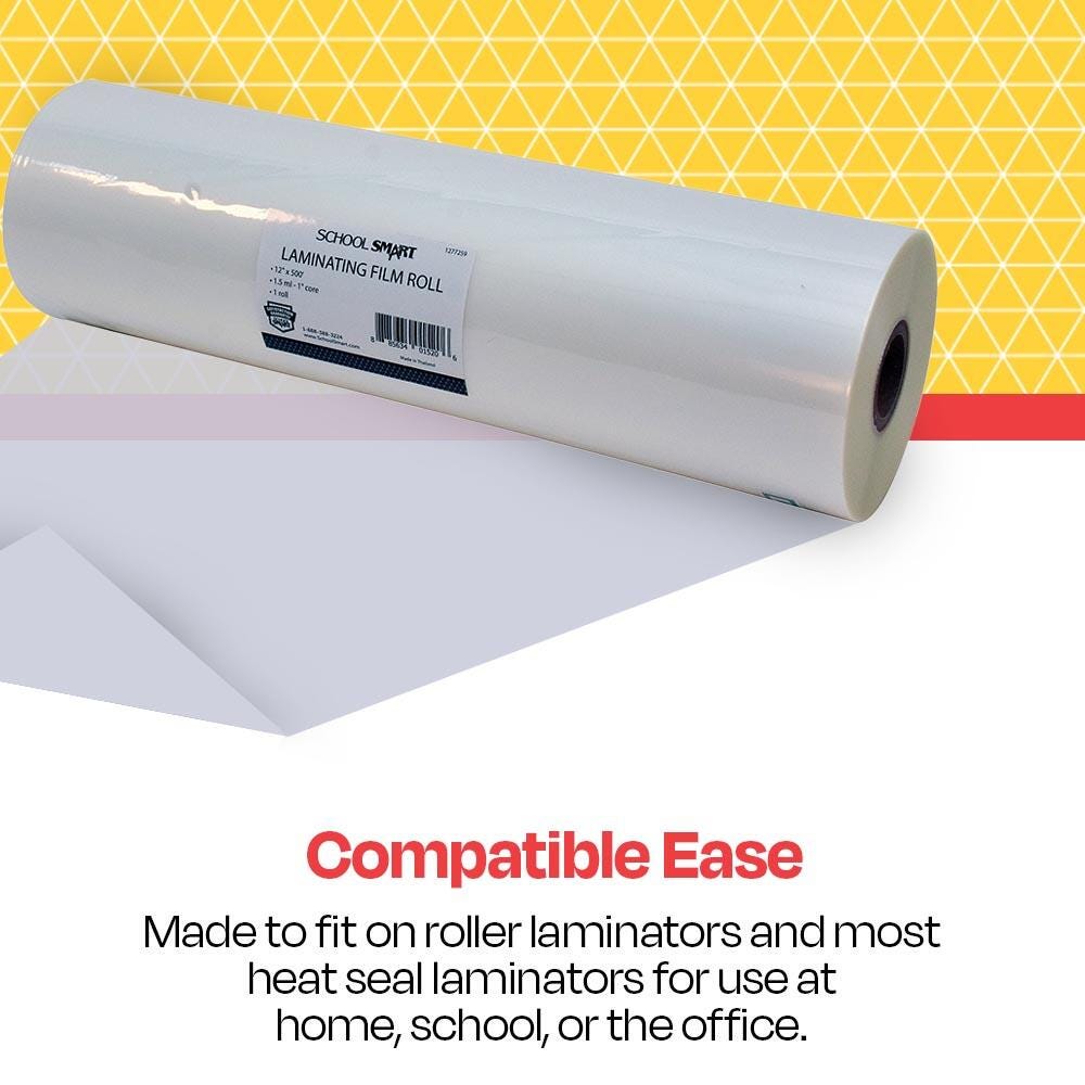 This high-gloss laminating film by School Smart comes on a 1-inch core and is specifically designed for use with roller laminators. Compatible with most brands of heat seal laminators, this laminating film provides a versatile and reliable option for schools, offices, small businesses, and homes. The 500-foot roll provides a sizable amount of laminate for document protection, arts and crafts, signage, and a range of other projects.Please note: Works with most heat seal laminators, but does not work with EZ Load Acco/GBC laminators.