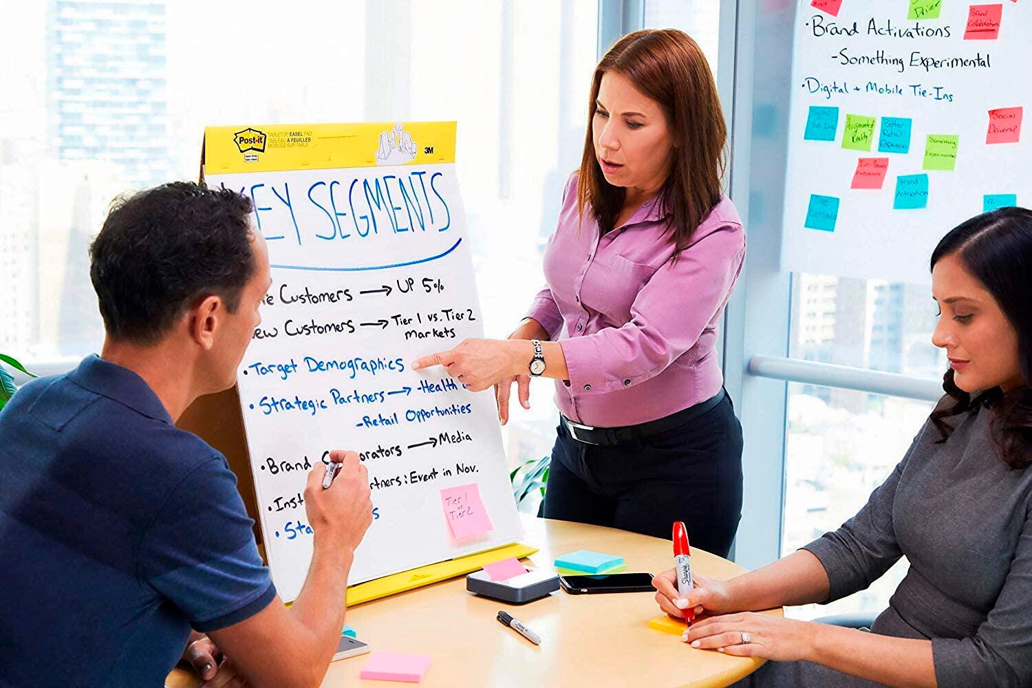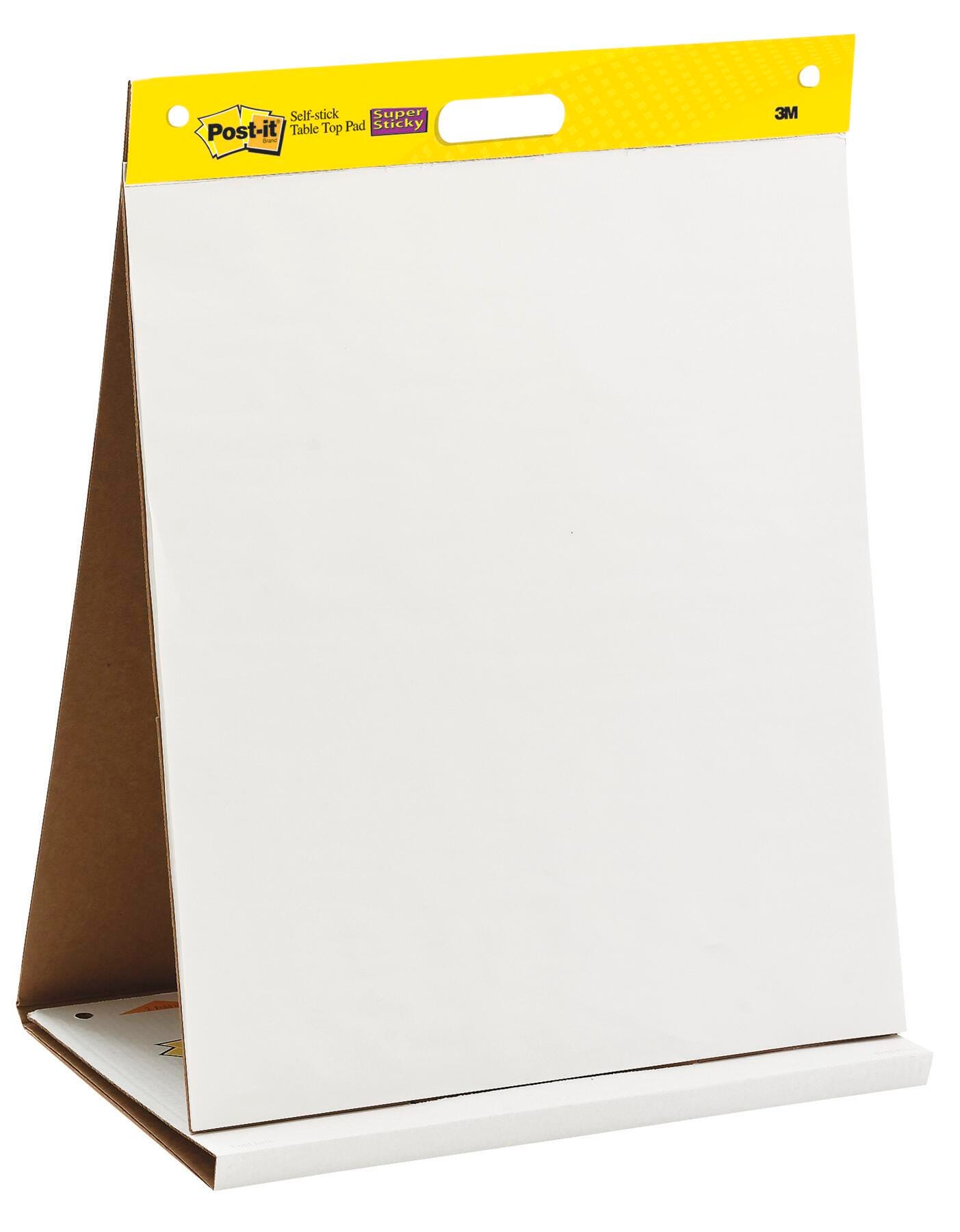 Turn the tables in your favor with Post-it Table Top Easel Pads. They give you all the advantages that Post-It Self-Stick Easel Pads offer plus a built-in stand that sets up easily in just seconds. They are ideal for small meetings and one-on-one presentations. The sturdy backcard easily converts to an easel stand for tabletop use. The bright white, premium sheets resists marker bleed-through; they stick to most surfaces and can be repositioned again and again, without surface damage.Features