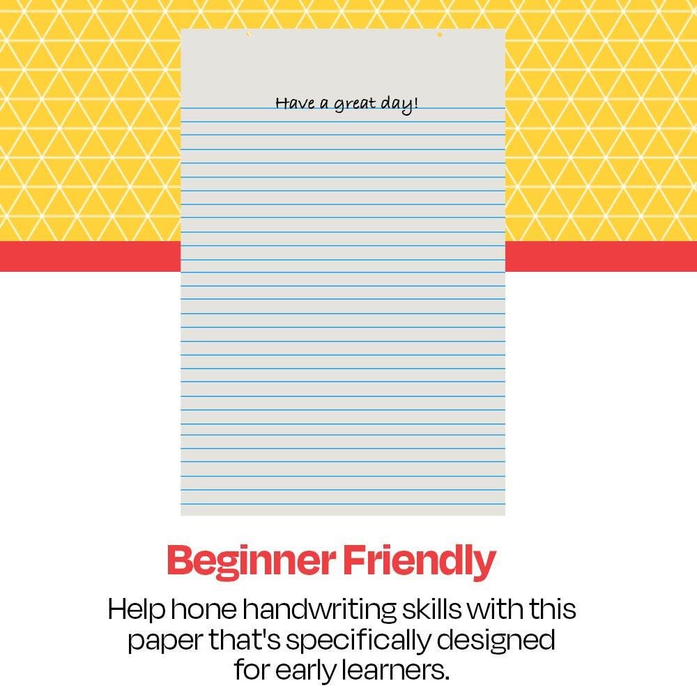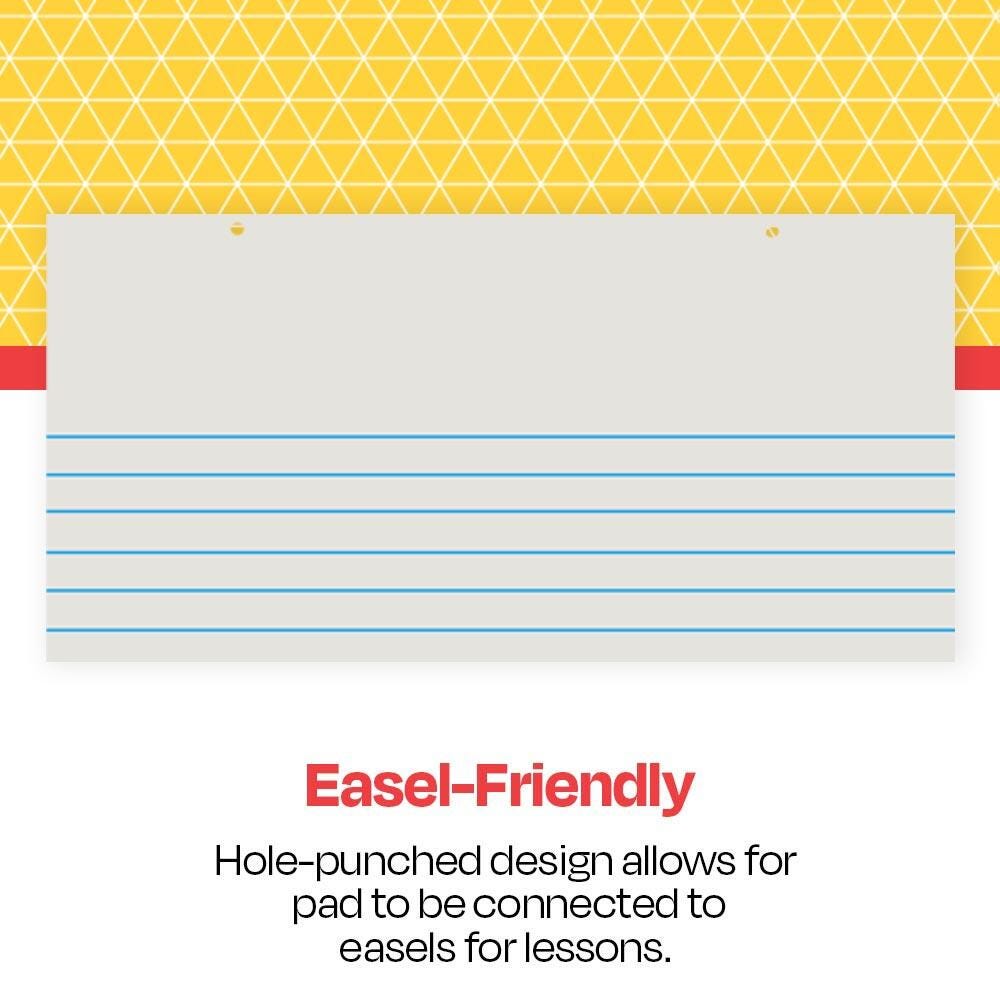 Write, draw, and teach with lined paper for students from School Smart! Acceptable for pencil or pen use, this pad of paper features 1-inch ruled lines and a 6-inch space at the top to provide room for story illustrations. The top is also two-hole punched at the top to provide the option of hanging a full pad of paper on bulletin board tacks, nails, or teacher easels. Paper is great for doing student presentations, handwriting practice, and showcasing big notes at the front of the class. The full pad contains 100 sheets.