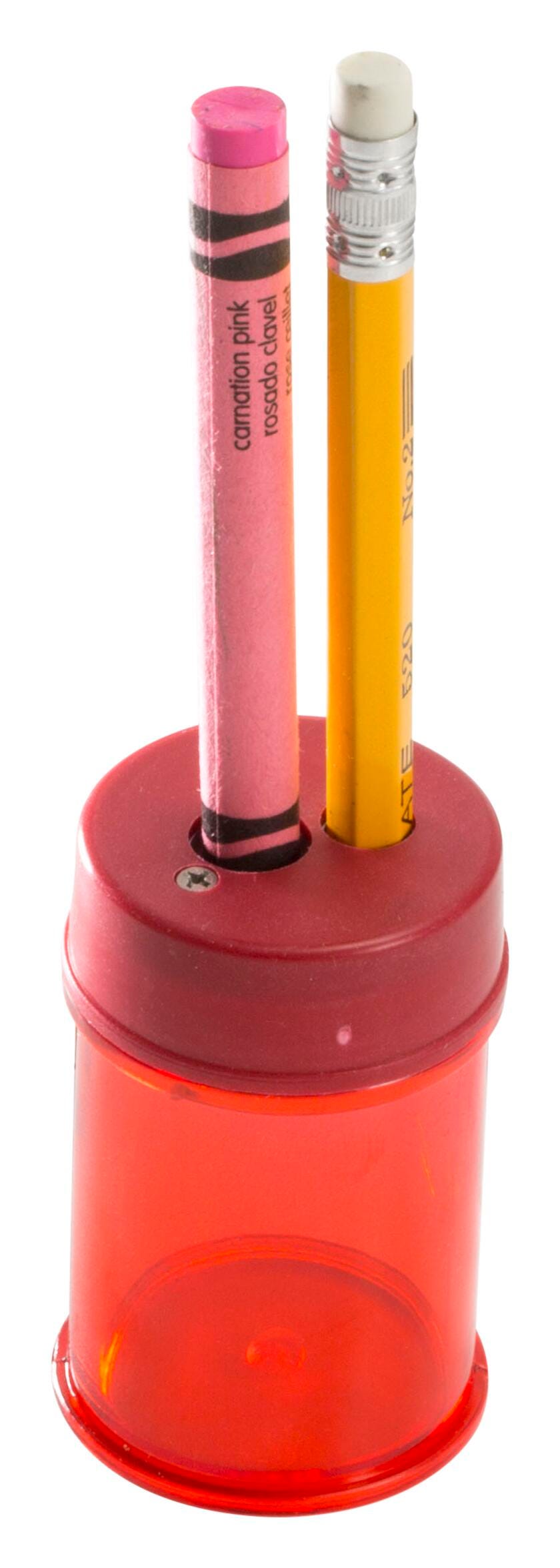 Pencil and crayon sharpener allows you to quickly sharpen your writing and coloring utensils. See-through receptacle allows you to see loose shavings for quick reference. Sharpener measures 2 x 1-1/2 x 1-1/2 inches and is perfect for use in a classroom or at home.