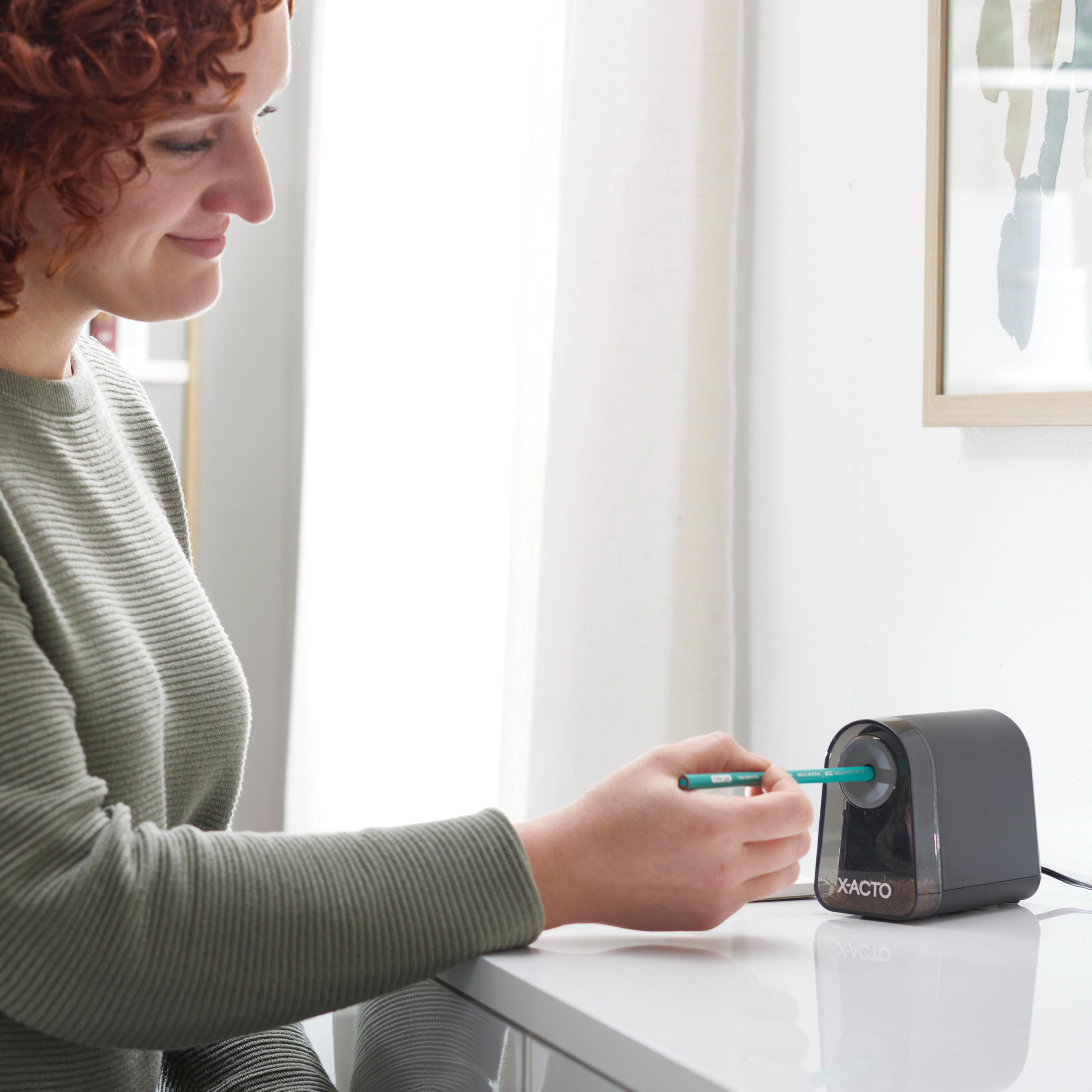 Safe and economical, the X-ACTO Mighty Mite’s Pencil Saver technology prevents oversharpening by disengaging the motor once the pencil has been precisely sharpened. The SafeStart® feature prevents operation while the shavings reservoir is removed. Powered by an energy-efficient electronic power adapter, this pencil sharpener's compact design and non-skid rubber feet make it the perfect fit for any desktop. It comes with 2-Year Warranty.