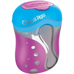 Ideal for coloring, the Color’Peps Pencil Sharpener is specifically designed for colored pencils because it sharpens to a rounded tip, which is safer for young children and will not tear through paper! The protective cap keeps the shavings contained within the body, and the compact size fits perfectly into pencil cases. Two holes accomodate standard and jumbo-sized pencils. Comes in 3 assorted two-tone colors. Each sharpener measures 3-3/4 x 1-1/3 x 5 inches.Features