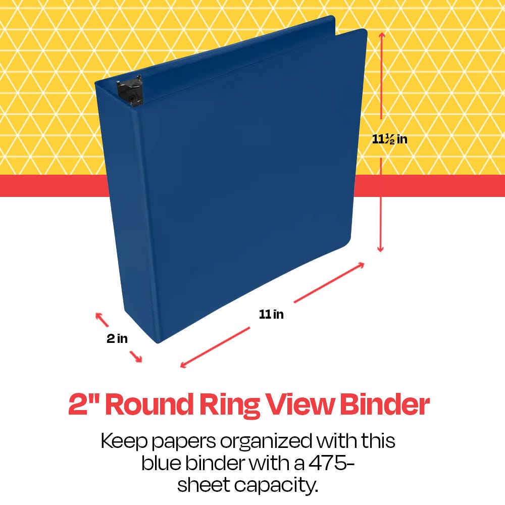 Gather records, paperwork, notes, and other essential papers with the School Smart blue 2-inch round ring view binder. Our durable O-ring binder with view pockets has a useful non-glare overlay on the front, back, and spine covers to allow you to insert custom labels or individual sheets for easy viewability and access. Cover pockets on the clear-view binder also prevent the transfer of ink from printed materials. The O-ring mechanisms are O-shaped and easy to open and close, so you can organize and store important sheets of paper in your 3-ring view binder. Made of polypropylene, the sturdy binder also has two deep inner pockets to hold loose sheets of paper. This O-ring file has a 425-sheet capacity, and the entire blue binder measures 11 x 11-1/2 inches.