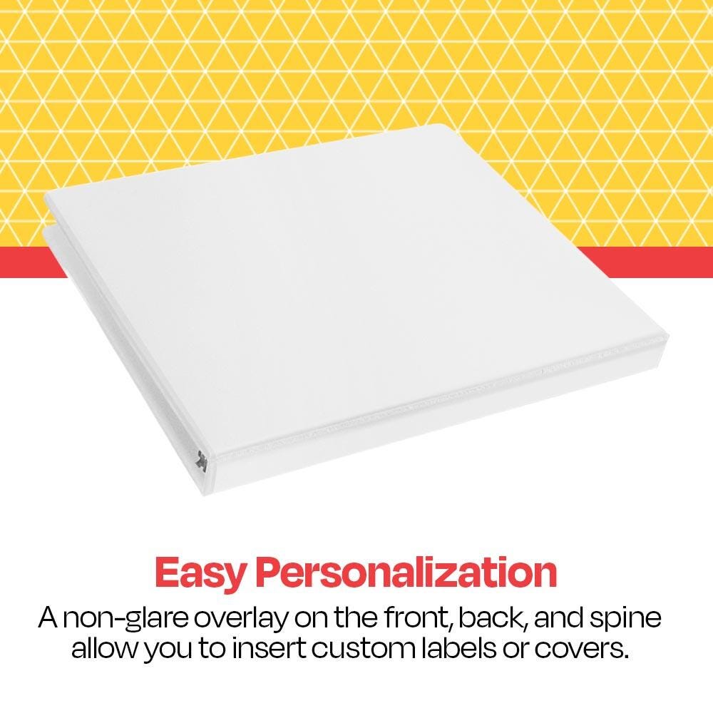 - Non-glare, PVC-free overlay on the front, back, and spine covers allows for customization on all three sides while ensuring ink from printed materials does not smear or transfer onto the half inch binder