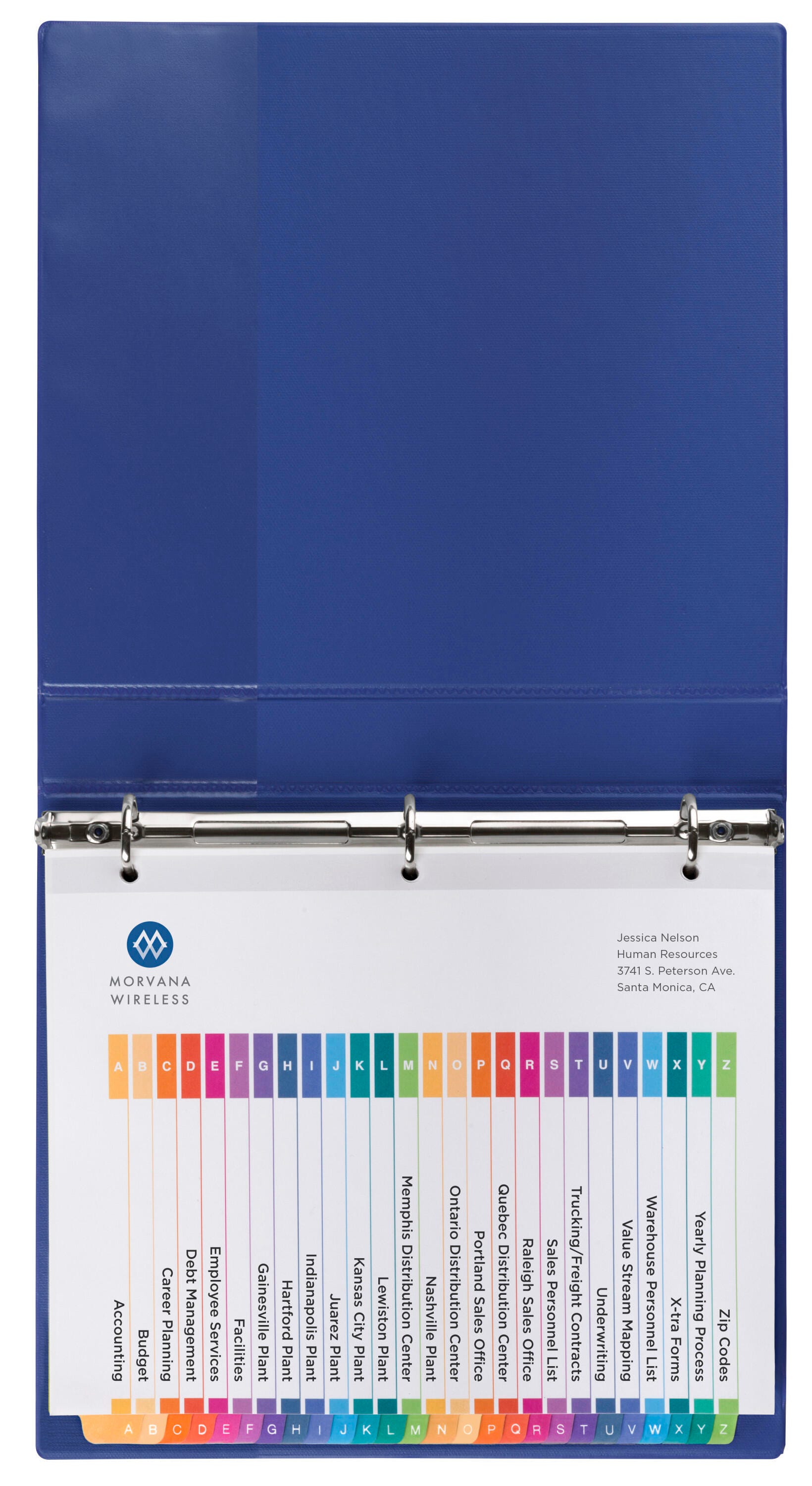 Coordinated divider system makes referencing easy and delivers a professional look. The set includes a reinforced Table of Contents page, matching preprinted tab dividers in assorted colors, added tab reinforcement, double-sided hole reinforcement on tabbed dividers and paper made of heavy stock. 2-in-1 tab design lets you pick between portrait and landscape formats. Simply print the section titles onto the Table of Contents page using your inkjet or laser printer. Tab dividers are also compatible with typewriters and copiers. Dividers are three-hole punched for use in binders. Avery offers many easy-to-use templates for Microsoft Word and other popular software programs.