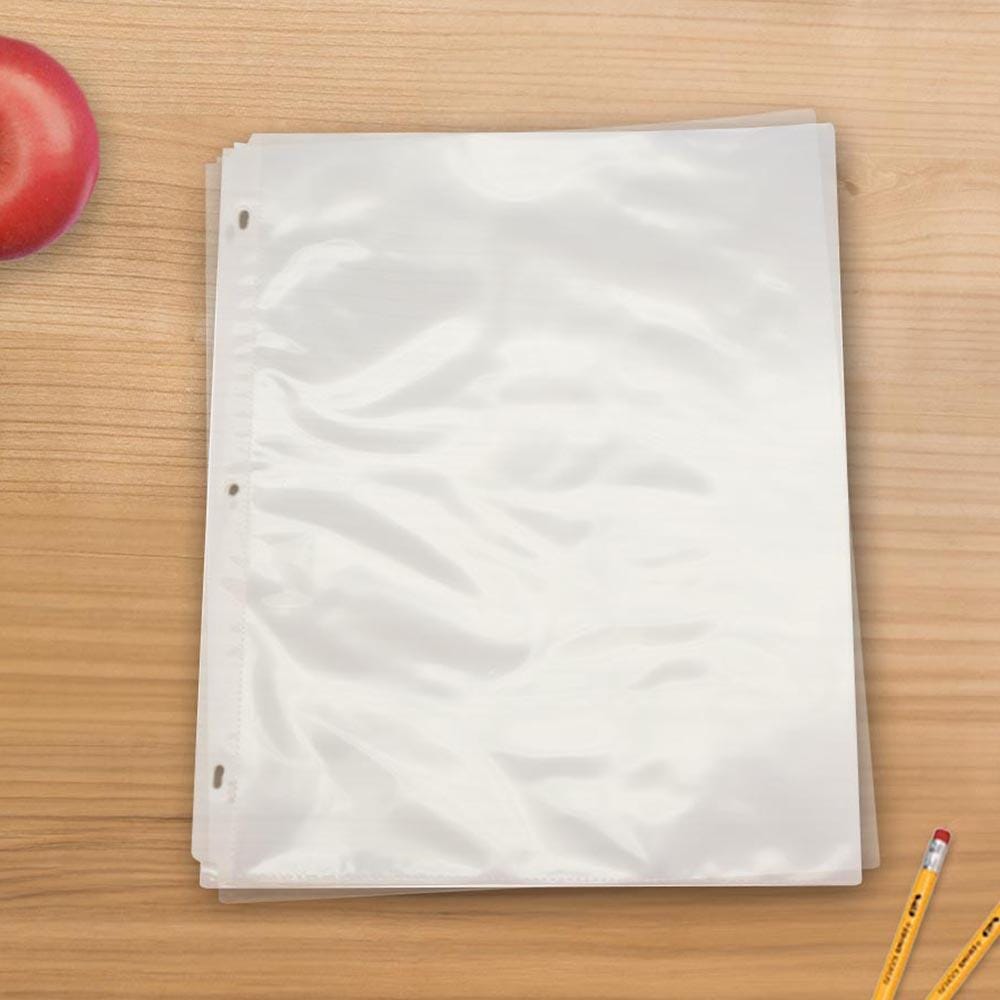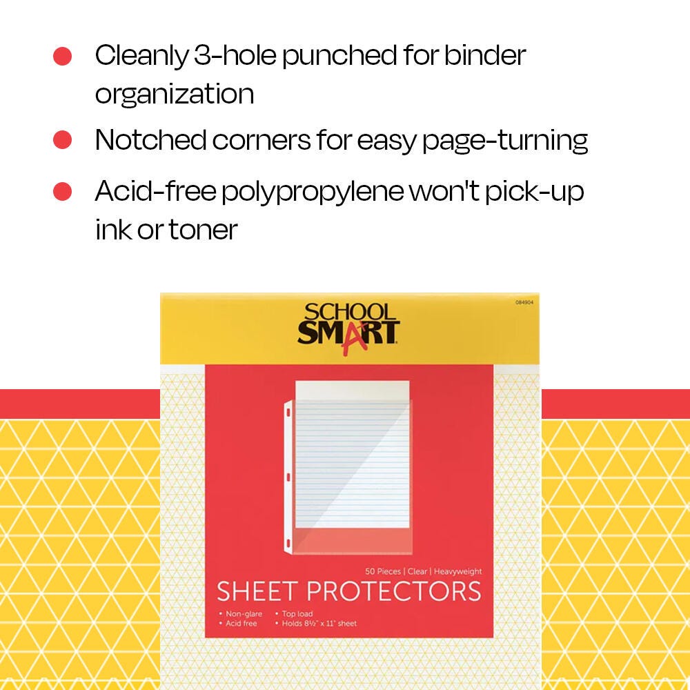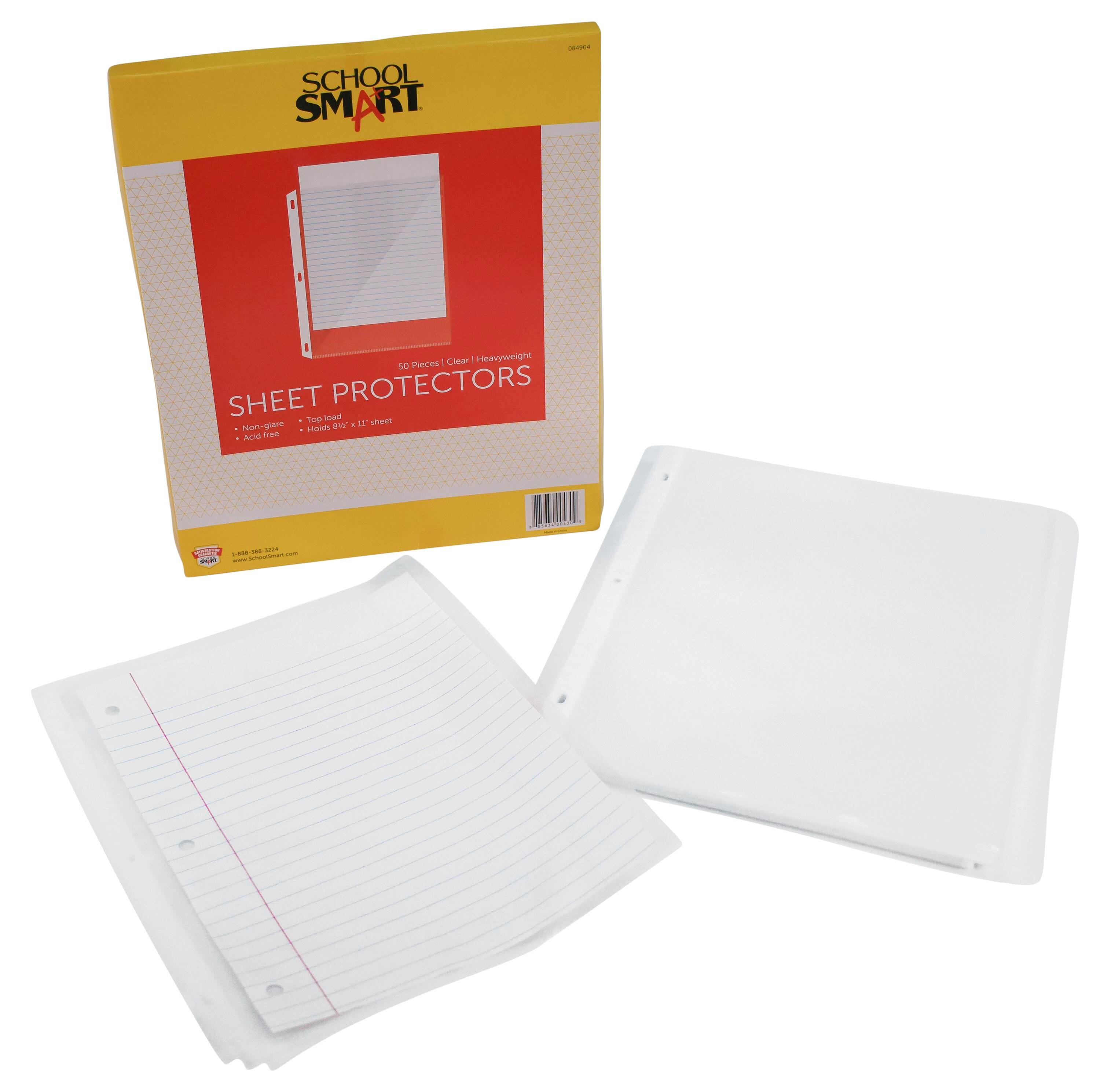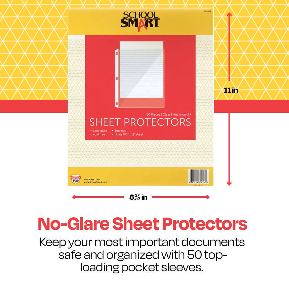 School Smart no-glare, top loading sheet protectors reduce light reflection so your papers are easier to read. This multipack includes 50 clear pocket sleeves for three ring binders. Each heavyweight non-glare sheet protector features a sturdy polypropylene construction with reinforced edges, cleanly punched holes, and notched corners for convenient page turning. Perfect for professionals, teachers, and students, the top-load poly sheet protectors have a 3 hole punch and fit 3-ring binders.