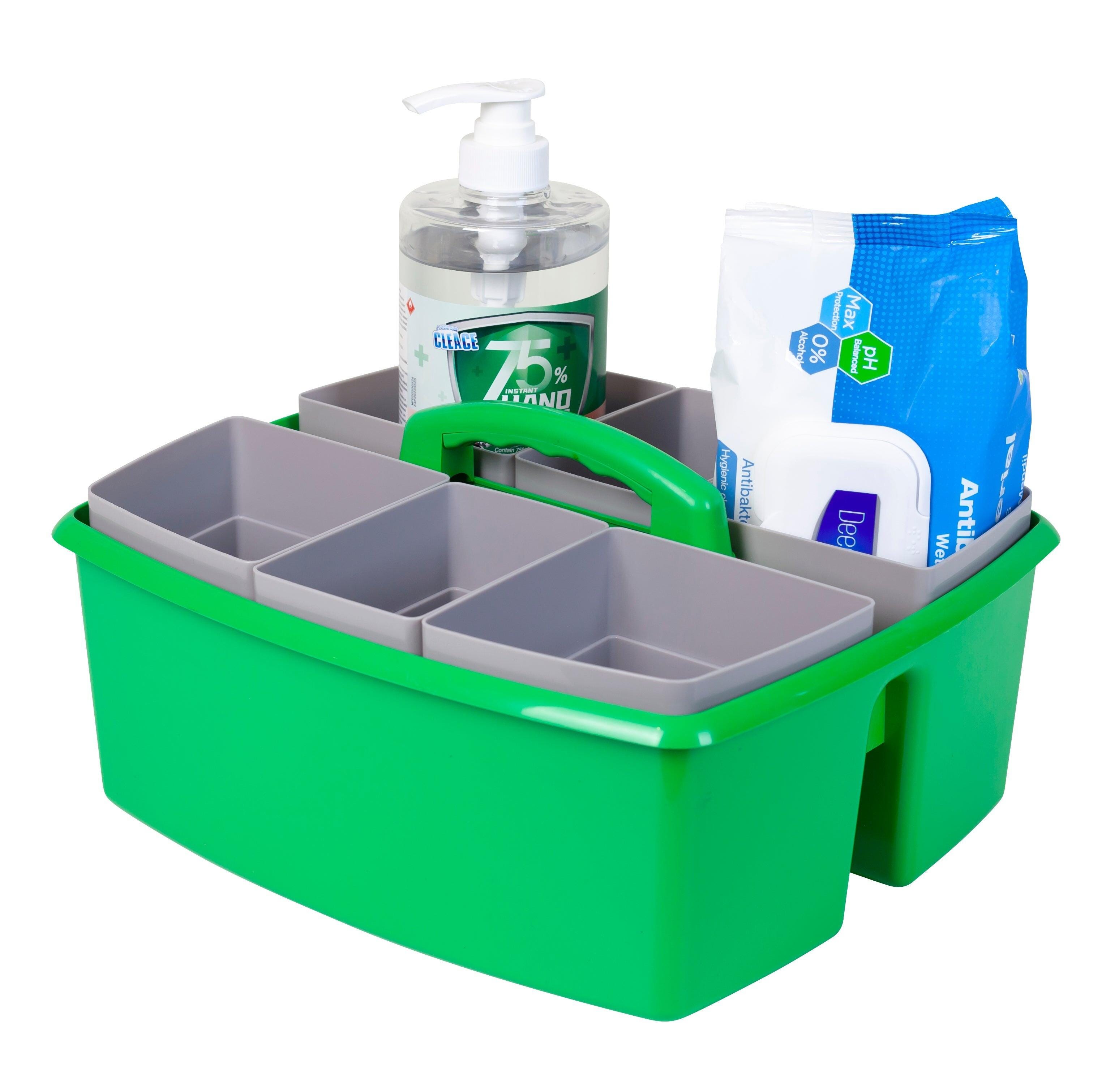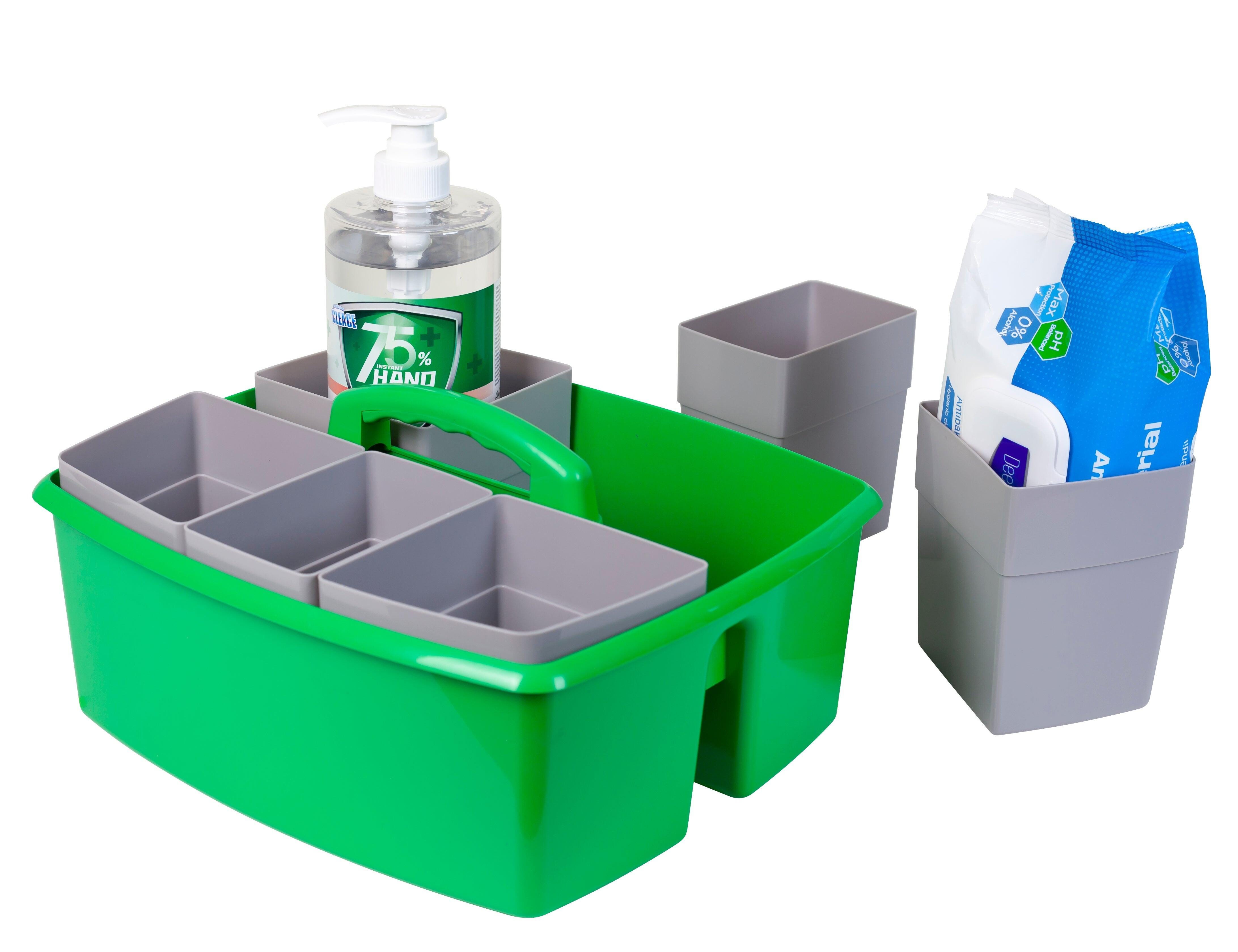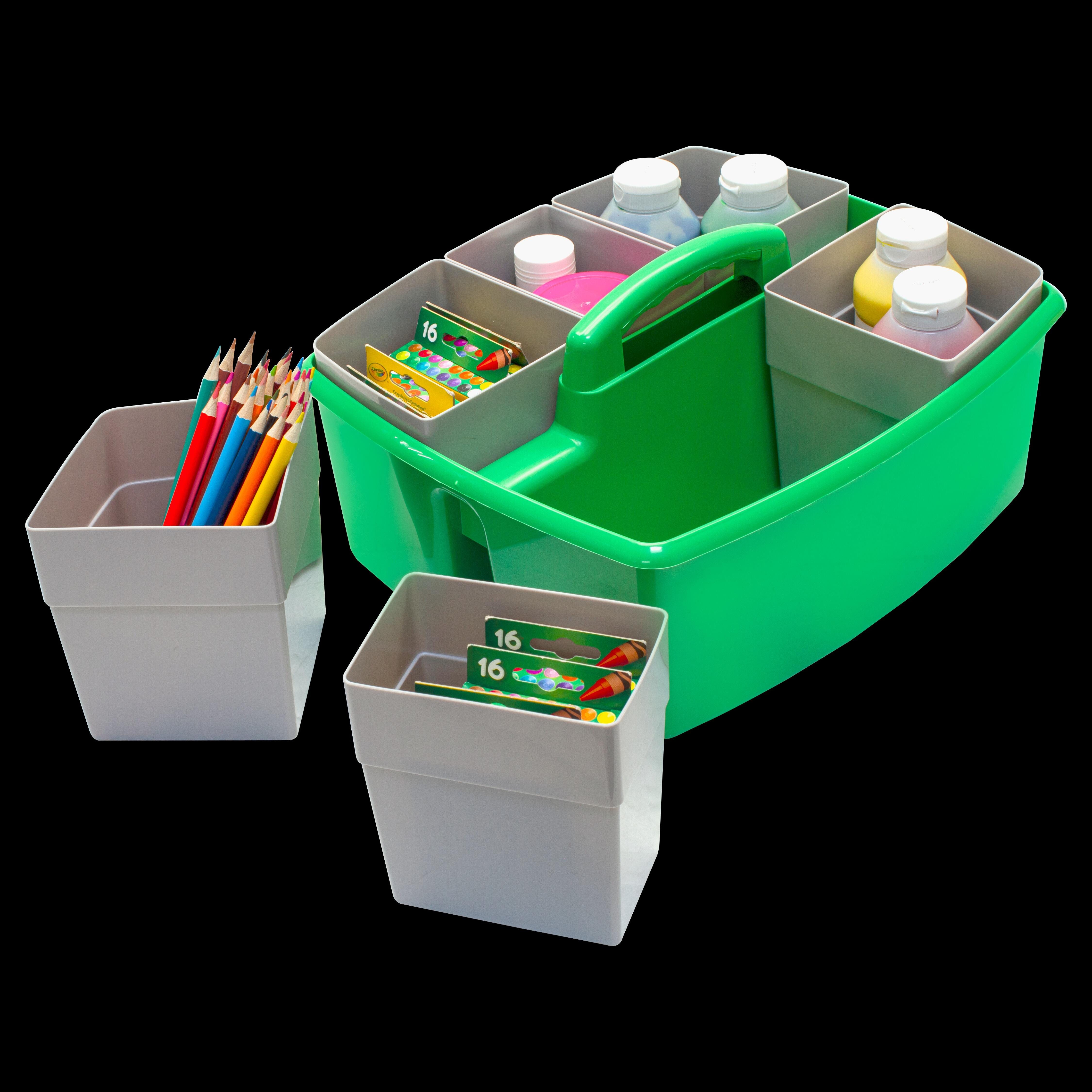 Stock up! This set of 2 caddies each contains two large compartments to store art supplies, washing accessories, or anything else you need to keep handy. Can also be used as phone storage! Each has a comfort grip for easy carrying, as well as 6 cups for storing smaller supplies like scissors, glue sticks, paint brushes, chargers, and other items your classroom needs. Cups can be taken out or placed in caddies as user sees fit. All caddies and storage cups are made of durable (and dishwasher safe) plastic construction for easy care. Each divided compartment in caddy measures 11-1/4 L x 4-1/4 W x 4-1/2 D inches. Sold as set of 2 green caddies, each with 6 separate sorting cups.Features