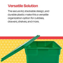 The School Smart green plastic cubby bin with lid can store school supplies, arts and crafts materials, toys, blocks, and more. Our versatile, stackable storage container can be used alone, stored within deeper drawers, or compiled into other storage containers. The included lid secures down firmly on top to help prevent young children from taking items out of the storage tub.Features