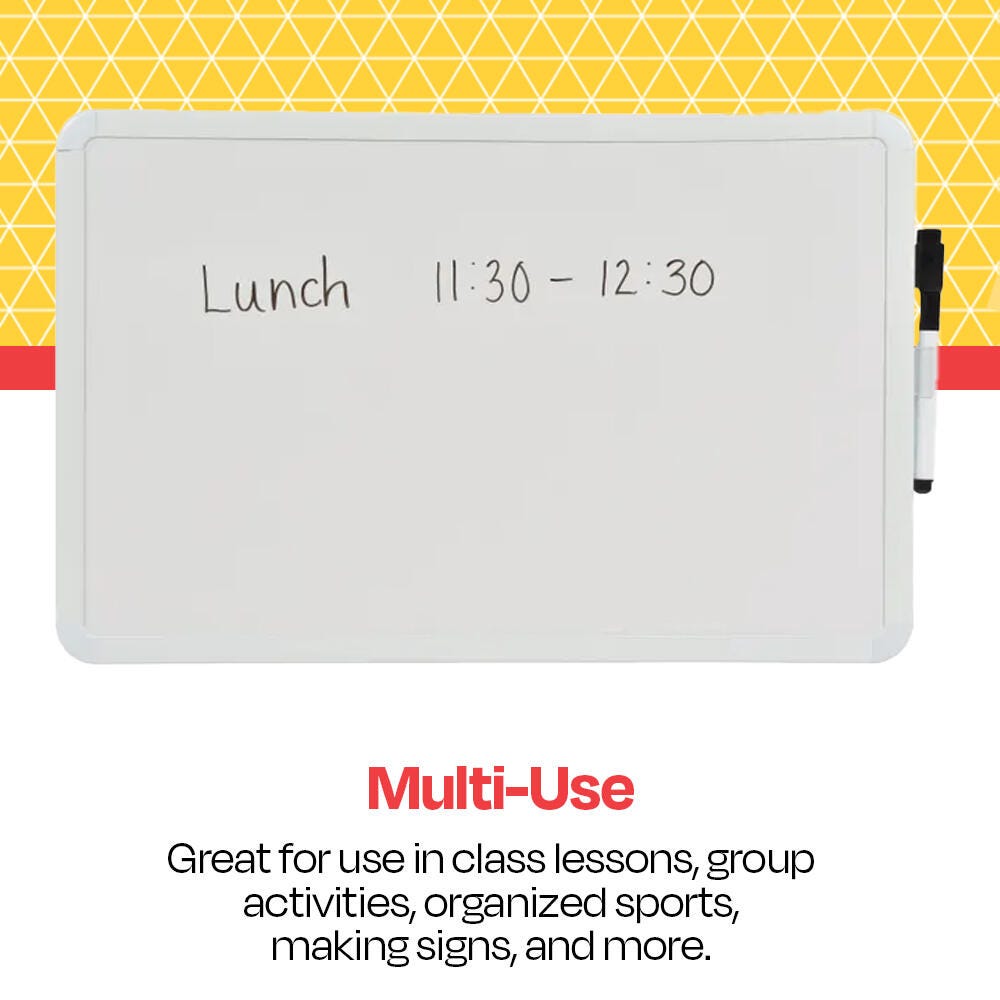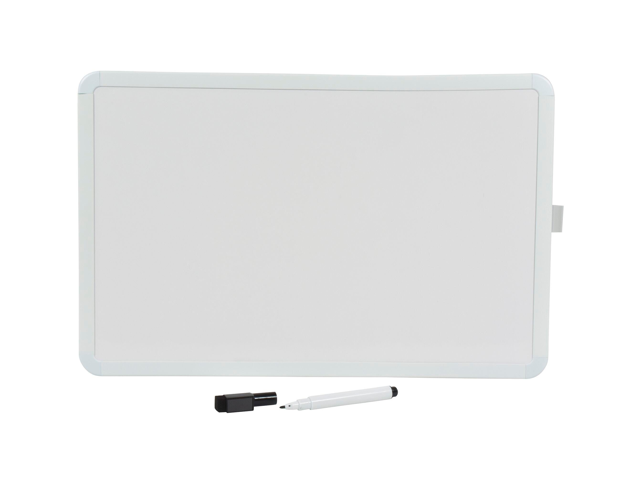 Make your mark (erase and repeat) with this fun and practical white dry erase board with marker set from School Smart. The whiteboard writing surface is a breeze to wipe completely clean for repeated use in the classroom, office, or home. A lightweight white frame adds style and allows the white wipeboard to be mounted on walls vertically or horizontally. Use it as a hanging whiteboard or a portable desktop one.
