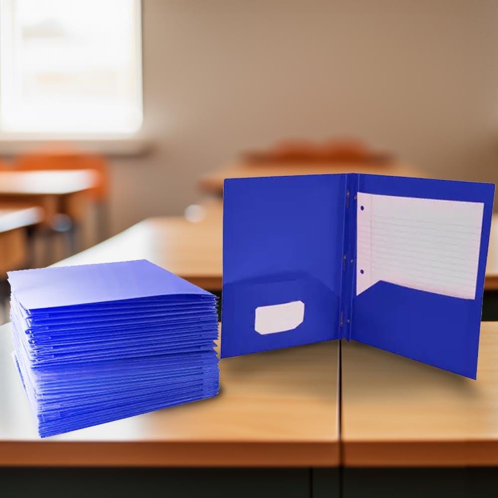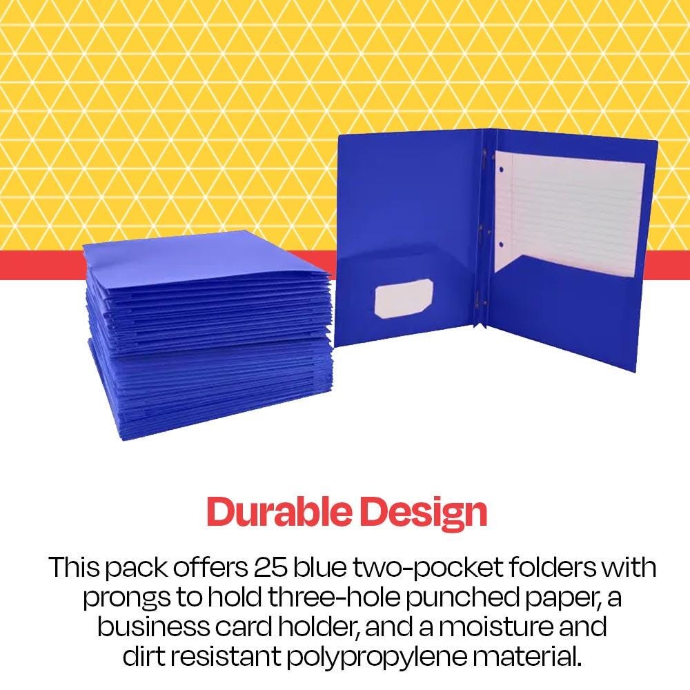 School Smart blue 2-pocket poly folders with fasteners make it easy to compile and file important documents. Our durable two pocket folders help keep letter-size papers and sheets straight, neat, and accessible in the classroom, office, or home. Flexible and lightweight (yet built to last), each blue plastic folder is made of durable polypropylene that resists moisture and dirt. The center includes an insert with push-down prongs to secure 3-hole punched documents and the left interior pocket has a business card holder. Use the heavy duty poly folder with brads for work, school, or personal use.