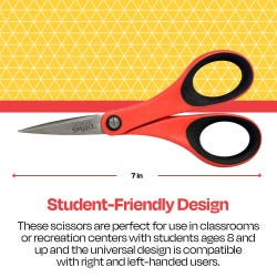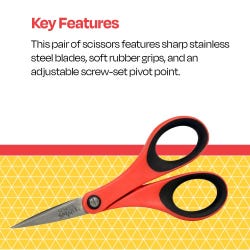 School Smart precision scissors are small but mighty. They’re created for both left and right handed use and ideal for cutting paper, fabric, craft foam, and other materials. The sharp scissors feature stainless steel blades molded into durable plastic handles. These scissors are also designed with a screw set pivot point which can be adjusted for firm or loose cutting action.Features