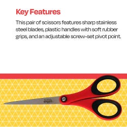 School Smart straight scissors are made for left-handed and right-handed users. They can cut paper, fabric, craft foam, and other materials. Our sharp standard scissors have stainless steel blades molded into plastic handles. In addition to the durable design, the scissor has a screw set pivot point which can be adjusted for firm or loose cutting action.