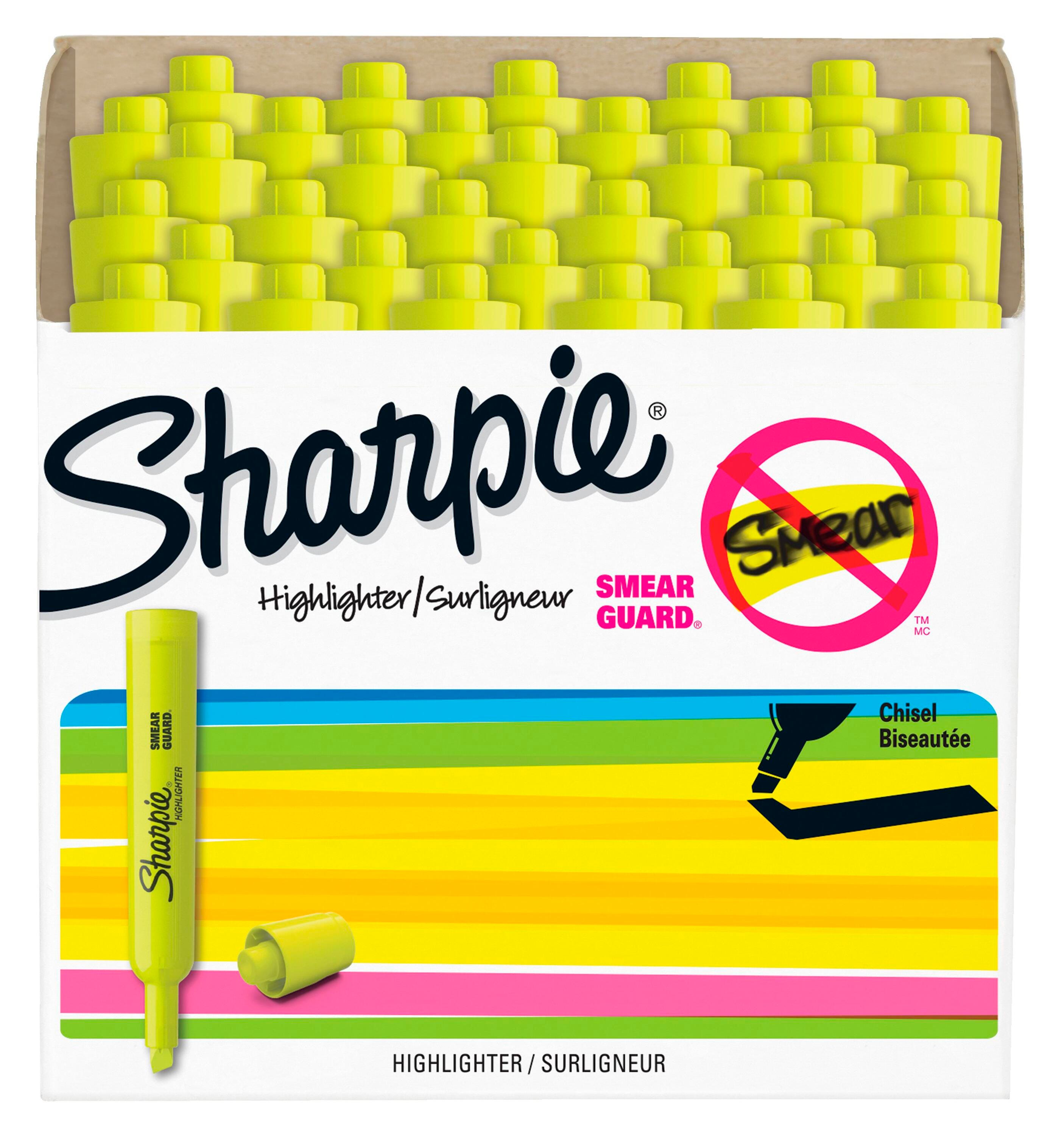 Sharpie Tank Style Highlighters feature a large ink supply so you get long-lasting, reliable use. Unique Smear Guard® ink technology is specially formulated to prevent smearing pen and marker inks. Comes with an easy glide chisel tip that is great for highlighting or underlining. The vibrant yellow ink is Sold as 36 per pack.Features