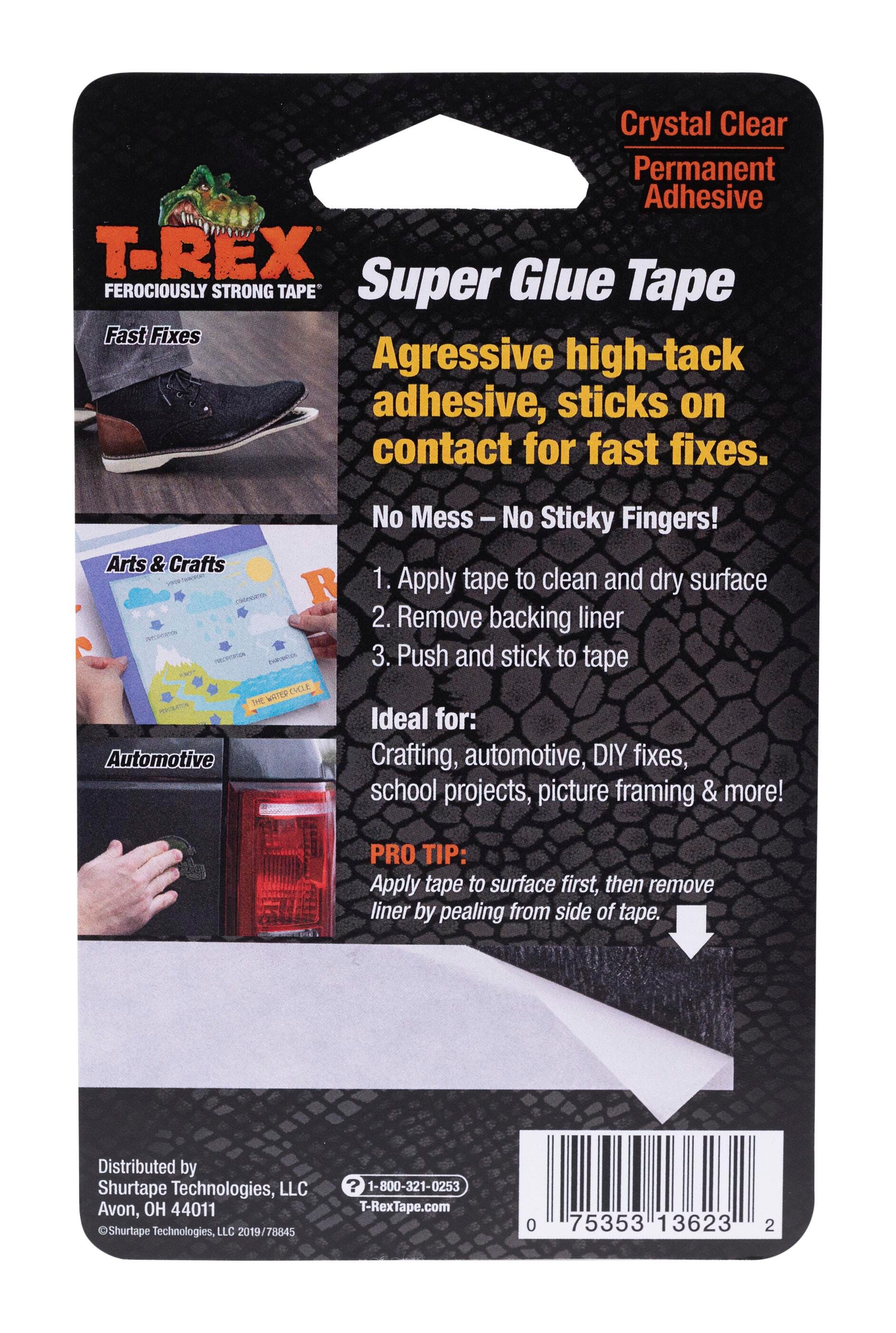 Make fast fixes and repairs with T-Rex Super Glue Tape. It features high-tack acrylic adhesive that sticks on contact. This double-sided super sticky tape is a great alternative to glue for mounting and automotive solutions, repairs requiring two surfaces to be adhered to each other, or craft projects. It provides aggressive adhesion on a variety of surfaces, including ceramic, concrete, glass, fabric, metal, plastic, tile, wood, and more.Features