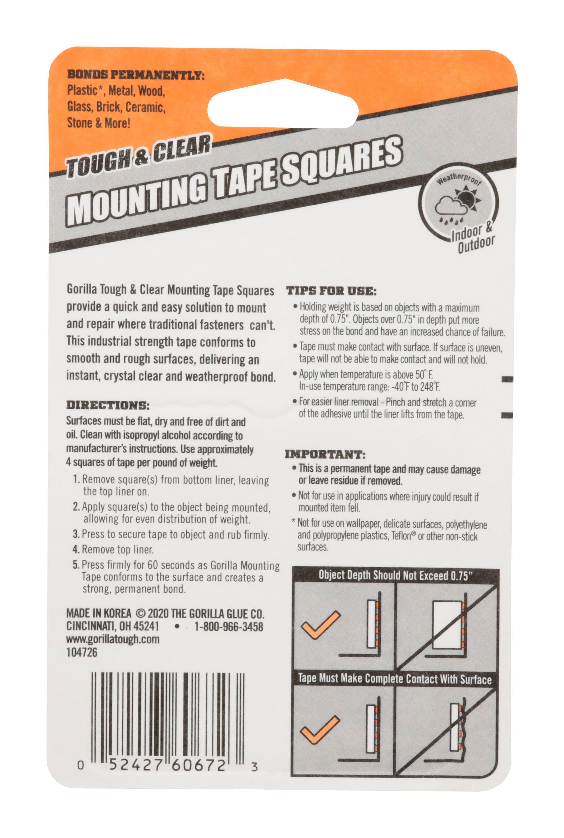 Gorilla Tough & Clear Mounting Tape Squares are clear, double-sided, 1 inch squares of tape that mount in an instant for a permanent, weatherproof bond. These crystal clear squares won't yellow over time, and hold up to 7 pounds! Gorilla Tough & Clear Mounting Tape Squares are perfect for indoor and outdoor projects and stick to smooth and rough surfaces. Completing DIY projects is easy with these pre-cut, double-sided squares. Mount, build and repair!Features