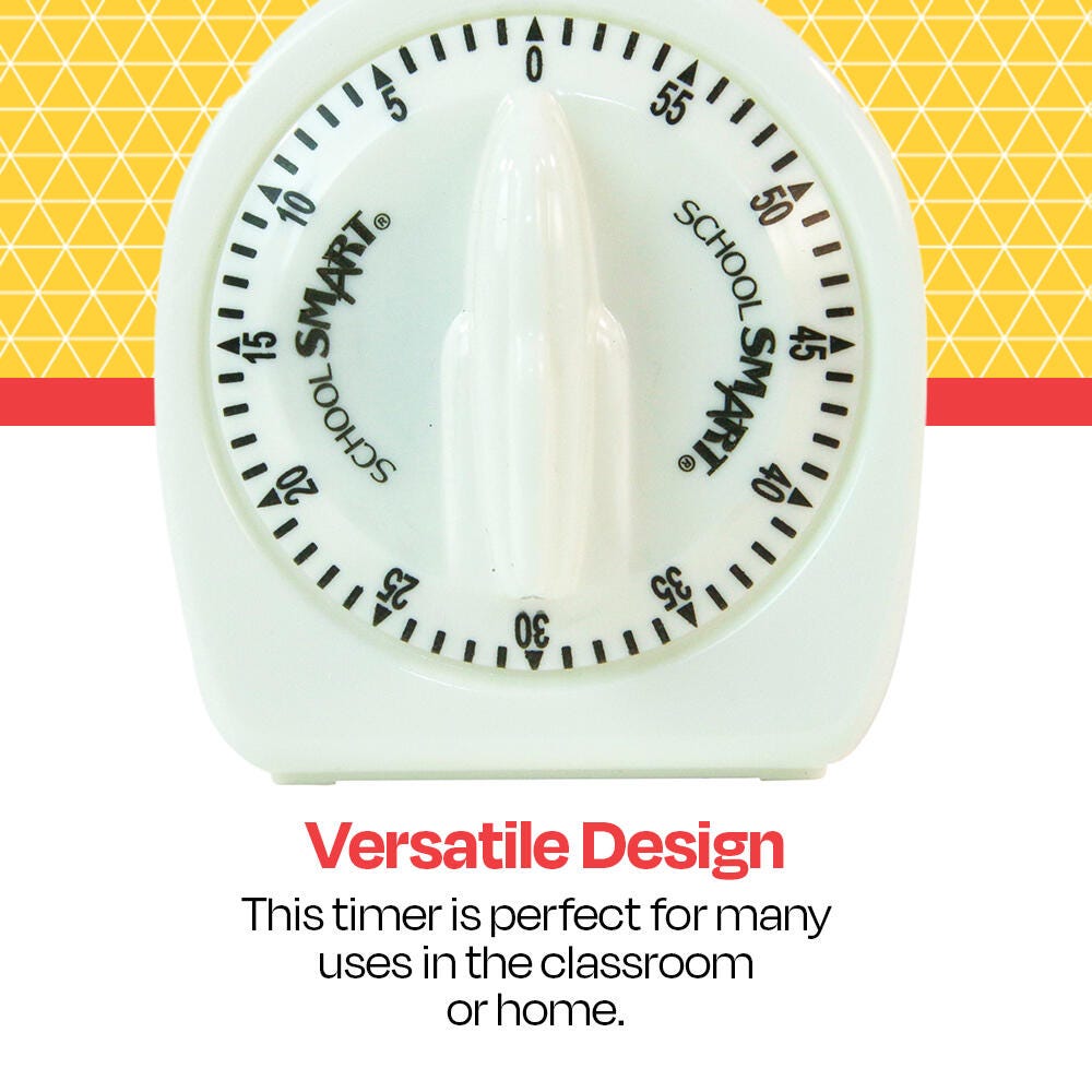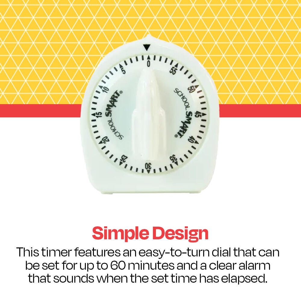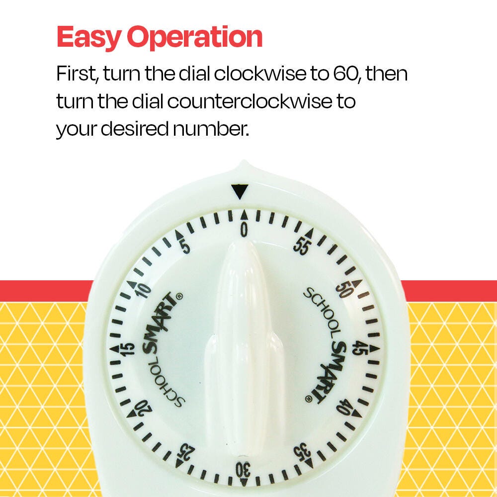 The School Smart wind up timer is easy to set and use. Our large minute timer measures 3-3/8 L x 3 W x 3-1/8 H inches. Just turn the dial with ease, and when the time is up, a distinct bell alarm will sound. The automatic shut-off timer has time intervals from 1 minute to 60 minutes. Our mechanical timer provides audible ticks as it’s counting down to help you track time. Instructions: Turn the dial clockwise to 60. Then turn the dial counter-clockwise to the number of minutes required.