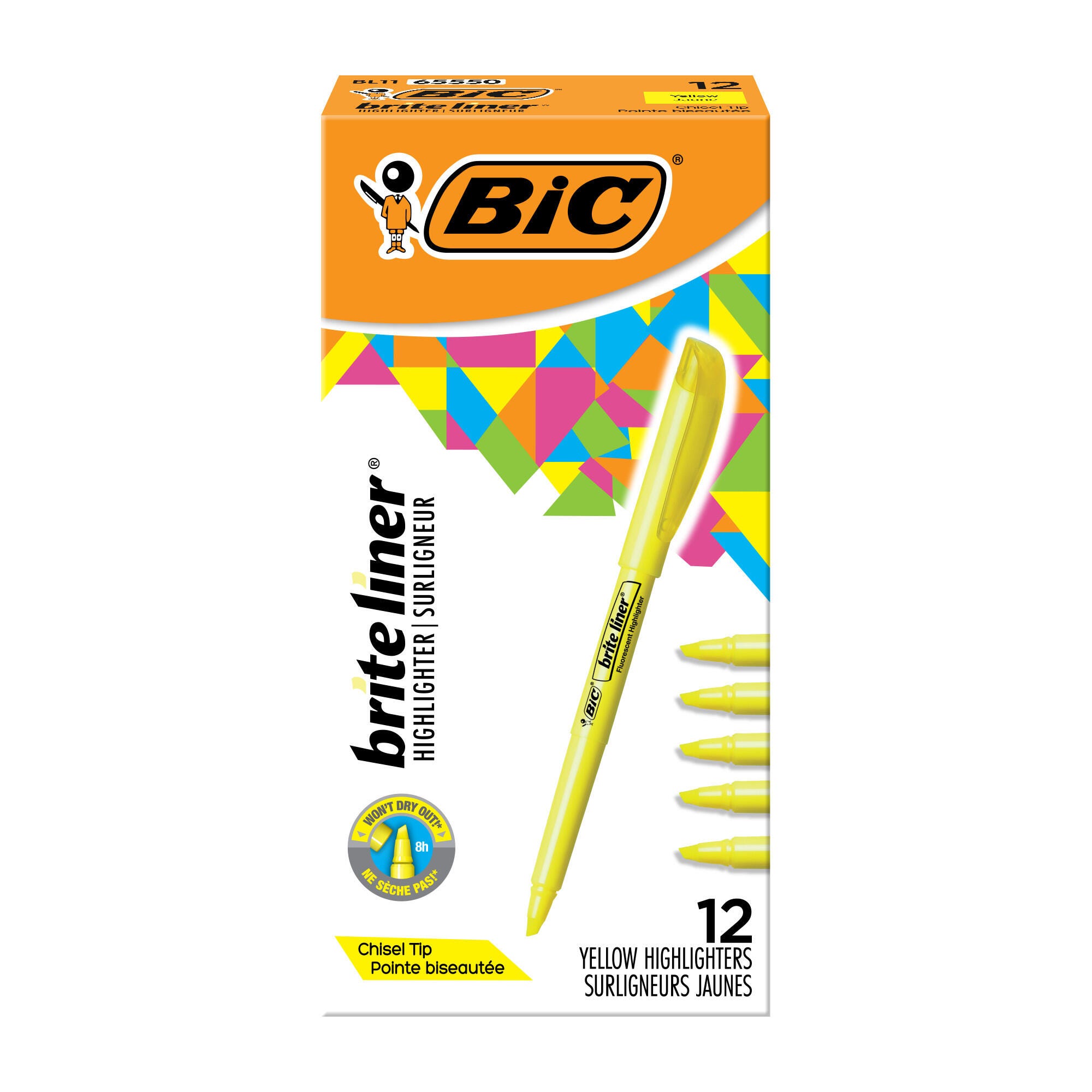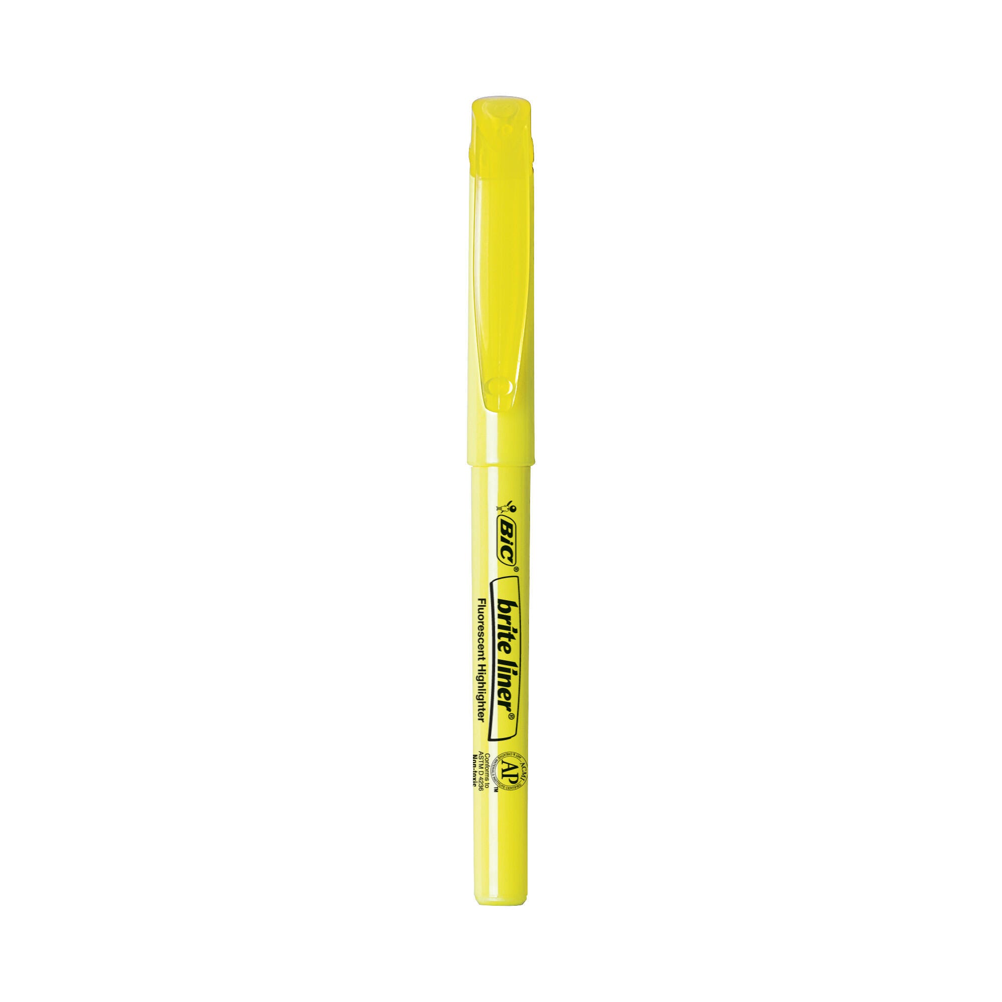 These BIC Brite Liner Highlighters feature a durable chisel point tip that makes it easy to highlight in neat lines with a consistent width. The translucent ink pops right off the page without covering or smudging highlighted text. A pen-shaped design provides an easy and comfortable grip during long studying or editing sessions. These highlighters are a must-have tool for any classroom or office and add a fun touch of color to reading and organizing. This pack contains 12 fluorescent yellow highlighters.