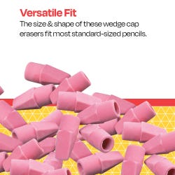These School Smart pink eraser caps offer easy erasing during any writing project! They come in a pack of 12 and fit perfectly on standard pencils. They easily erase pencil marks without any smudging. These pink eraser caps are not only fun and vibrant but also contain no allergens, making them a safe choice for everyone. Make these a handy addition to your school supplies!Features