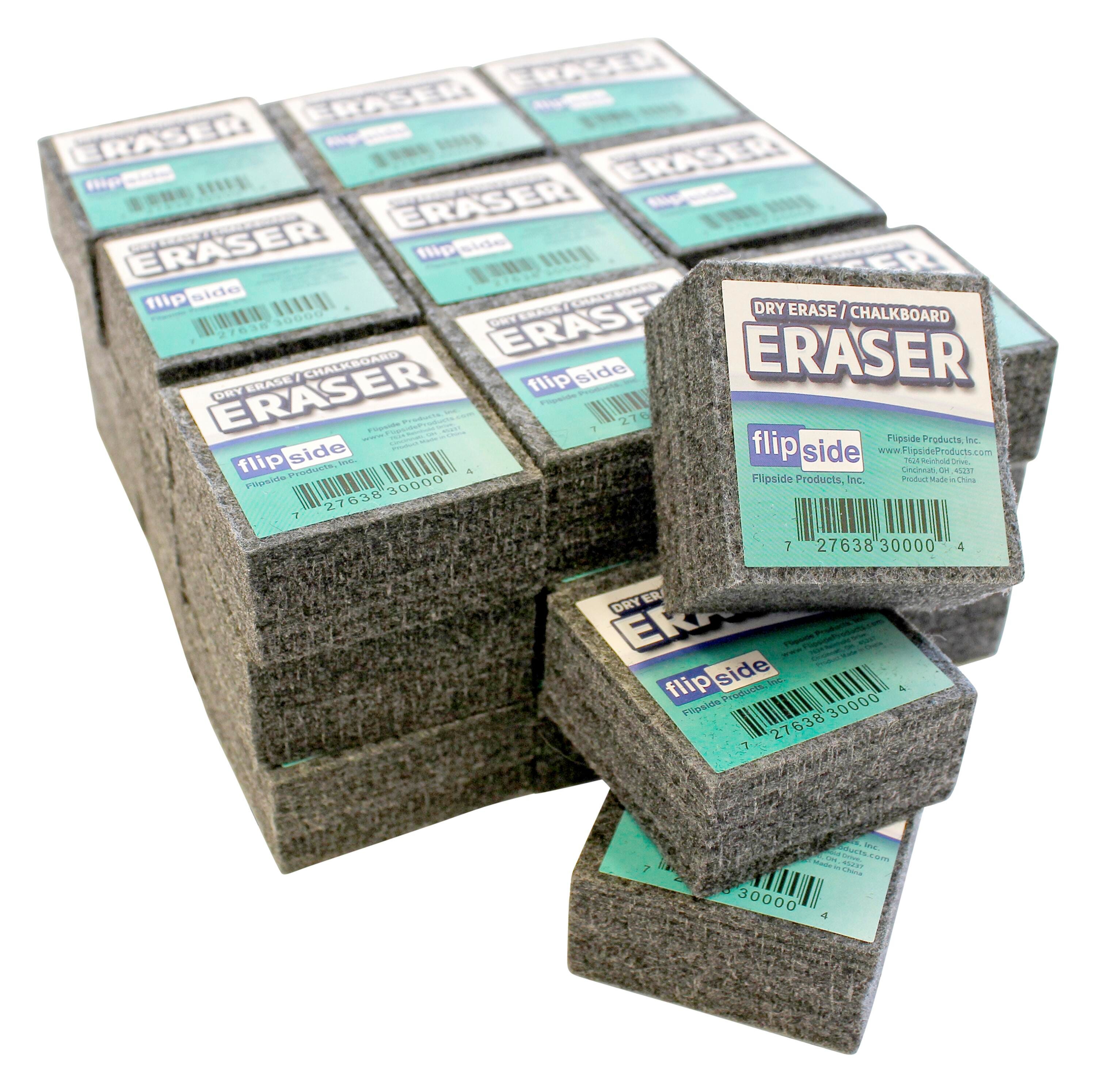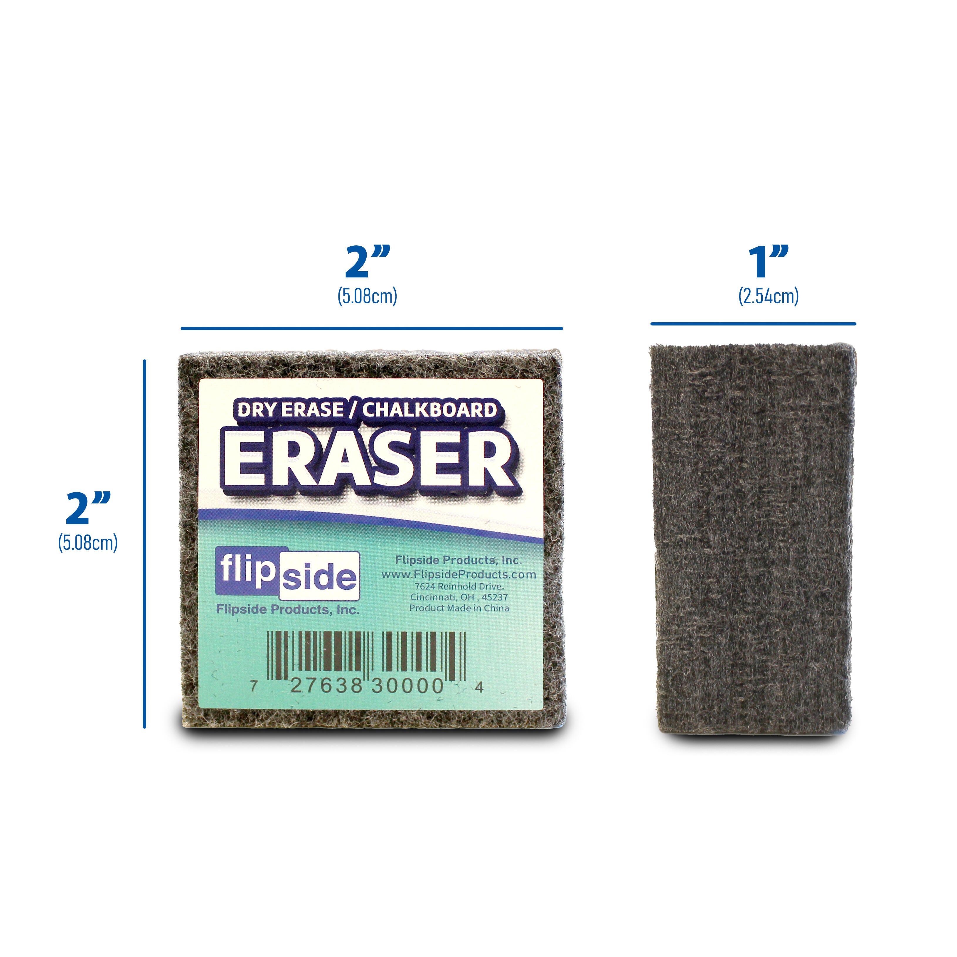 Flipside Student Dry Erase Eraser measuring 2 in x 2 in fits student's hands perfectly. Felt material works perfectly on both chalk as well as dry erase surfaces. It is and is sold as 30 per pack.