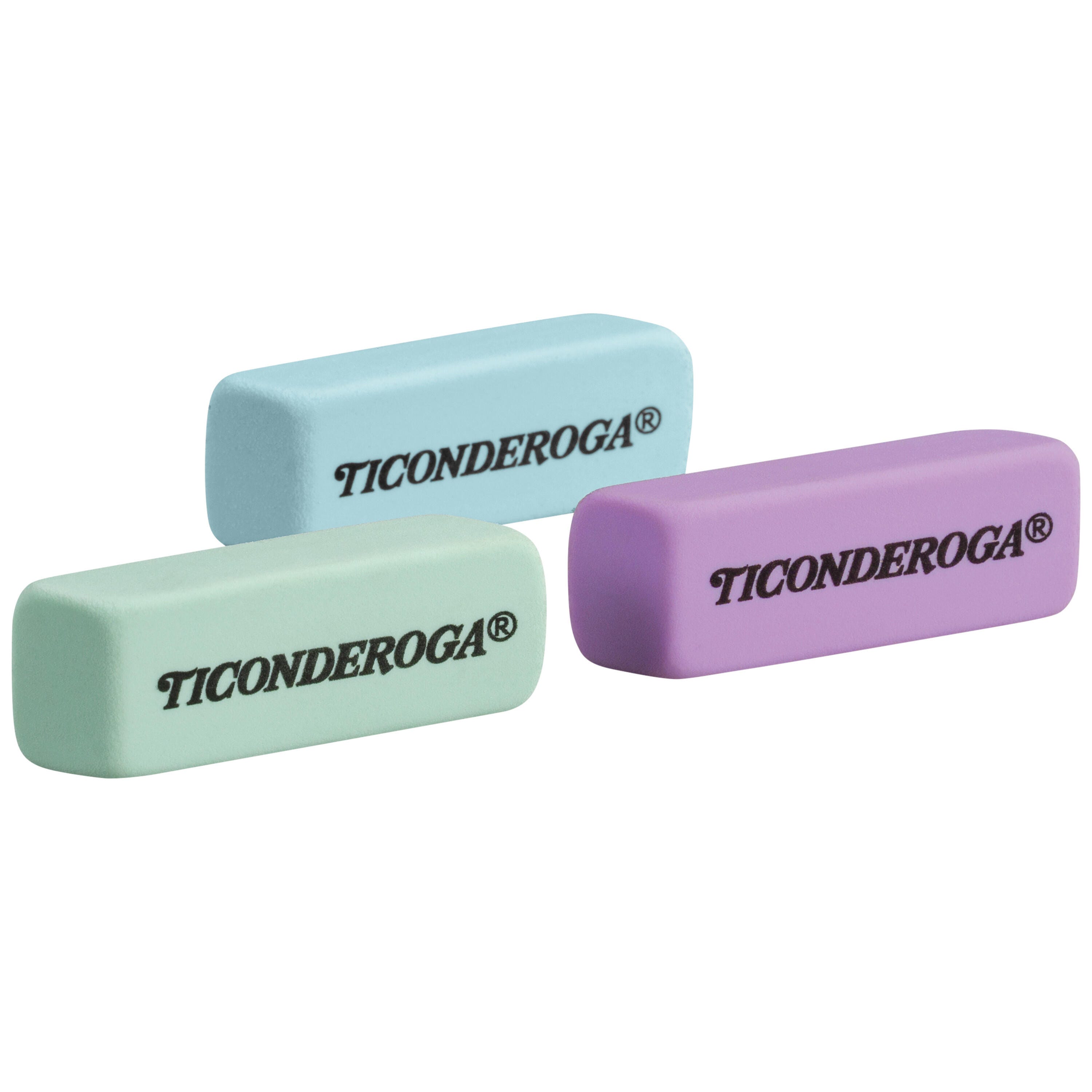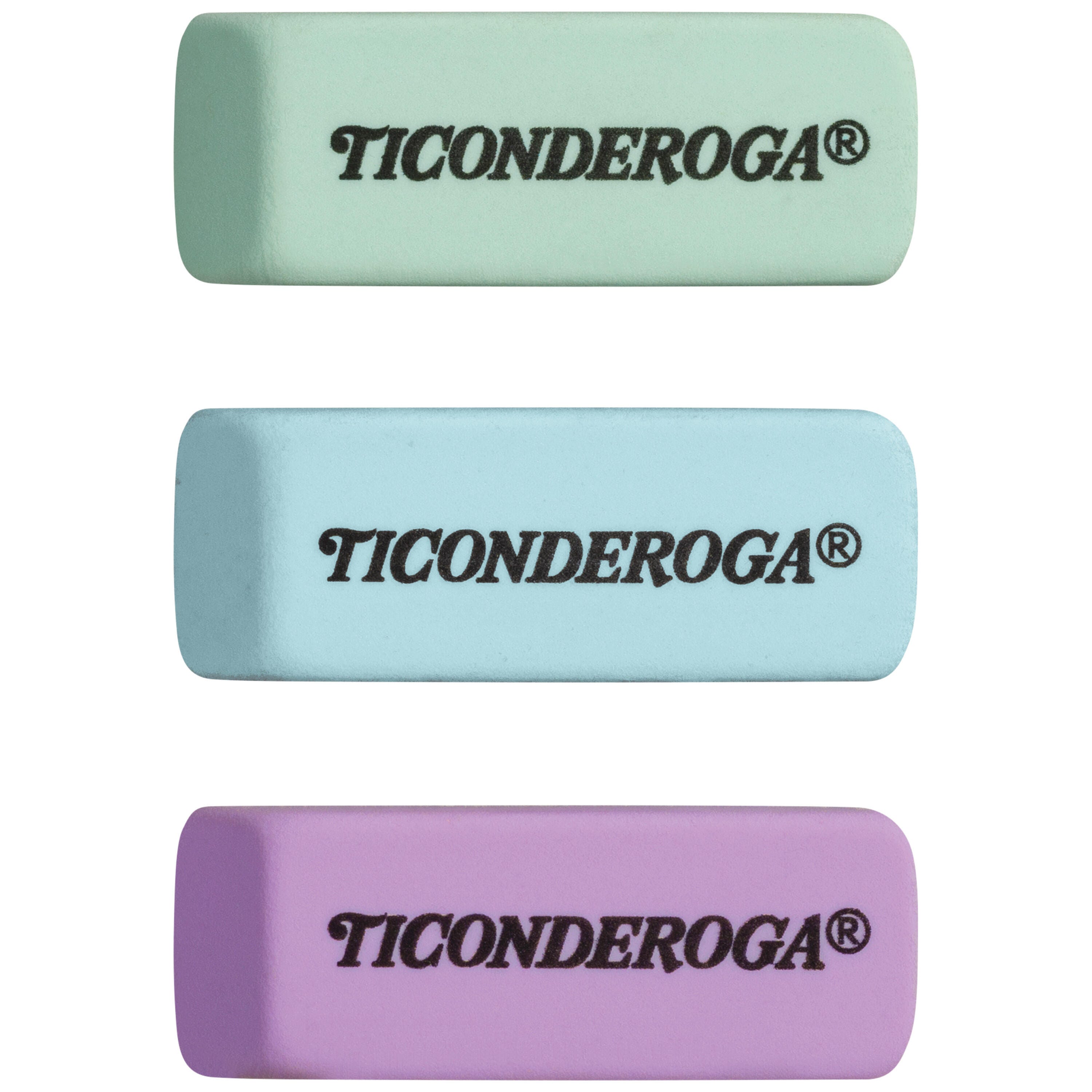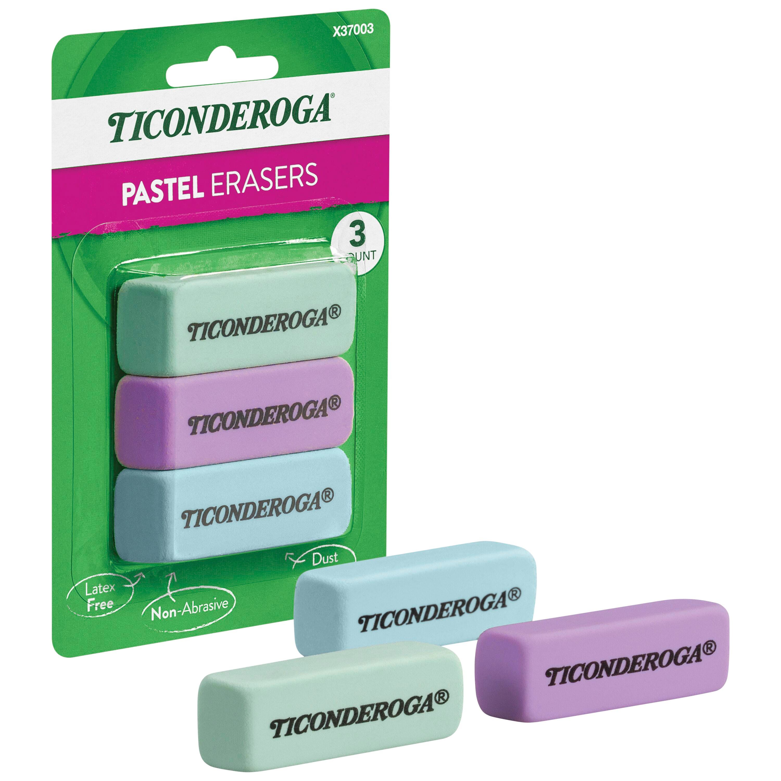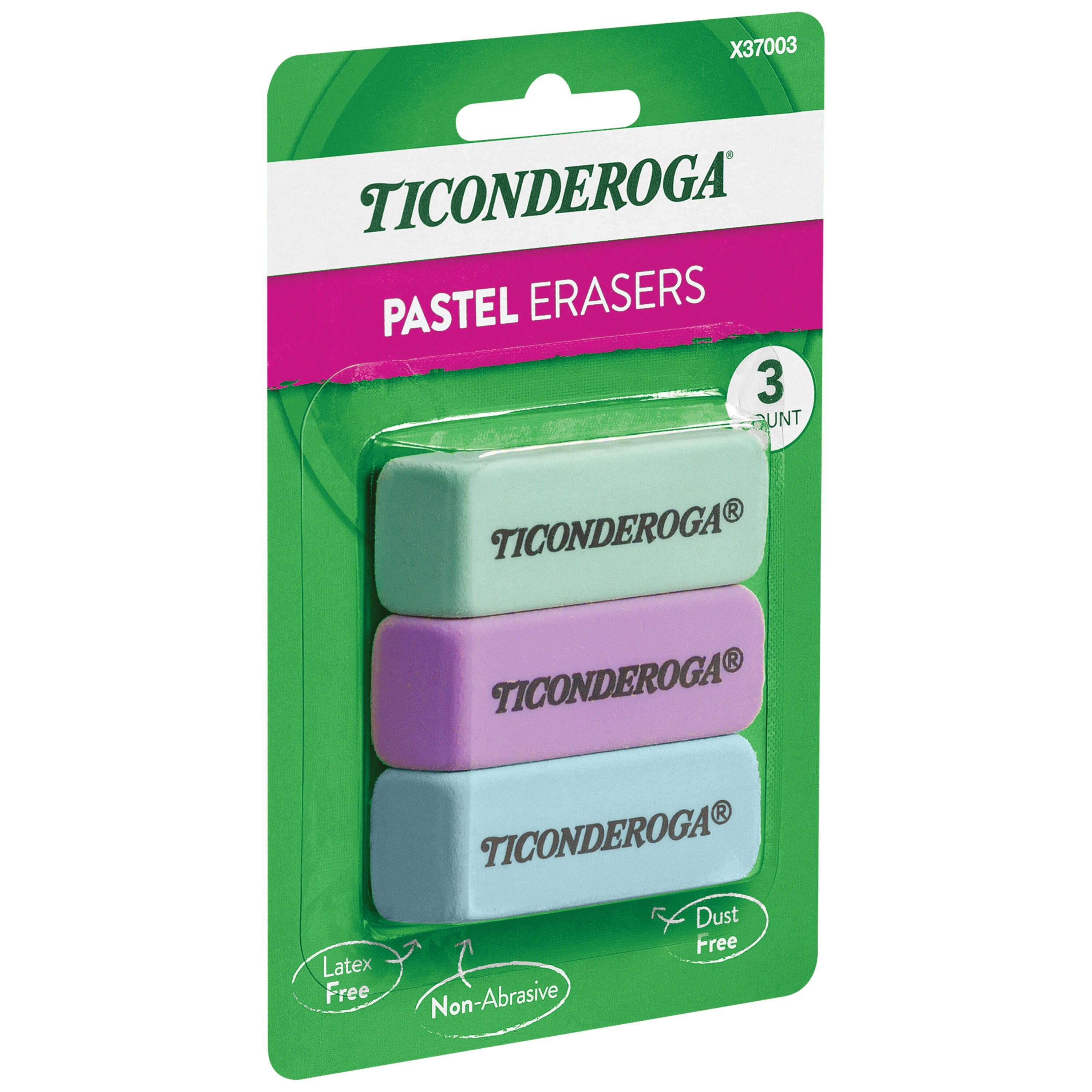 Ticonderoga Pastel Erasers bring a little fun to your home, school or office, while still delivering the same great Ticonderoga performance you expect. Beveled edges give you ultimate control over what you remove from the surface. These soft, latex-free neon erasers cleanly remove black pencil marks, leaving you with a clear, smudge-free surface and minimal residue. Package contains 3 medium size, hand-held erasers in assorted pastel colors. PMA certified non-toxic.