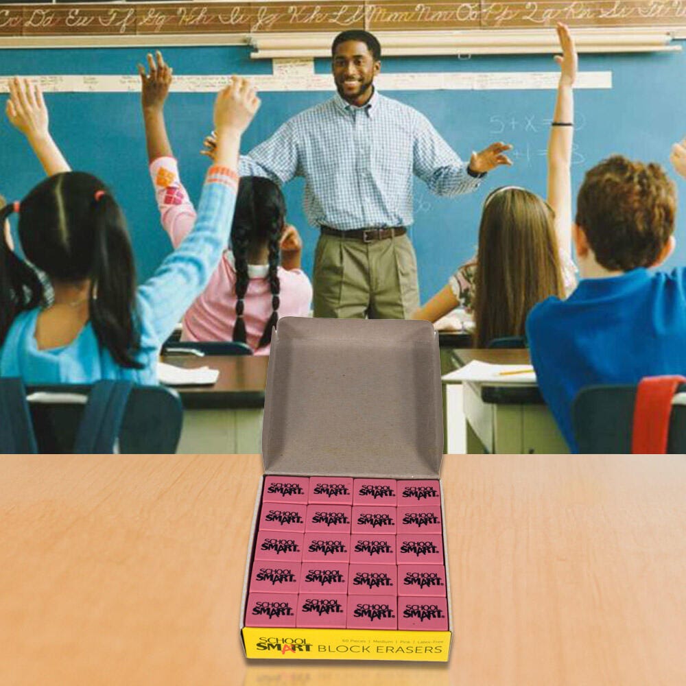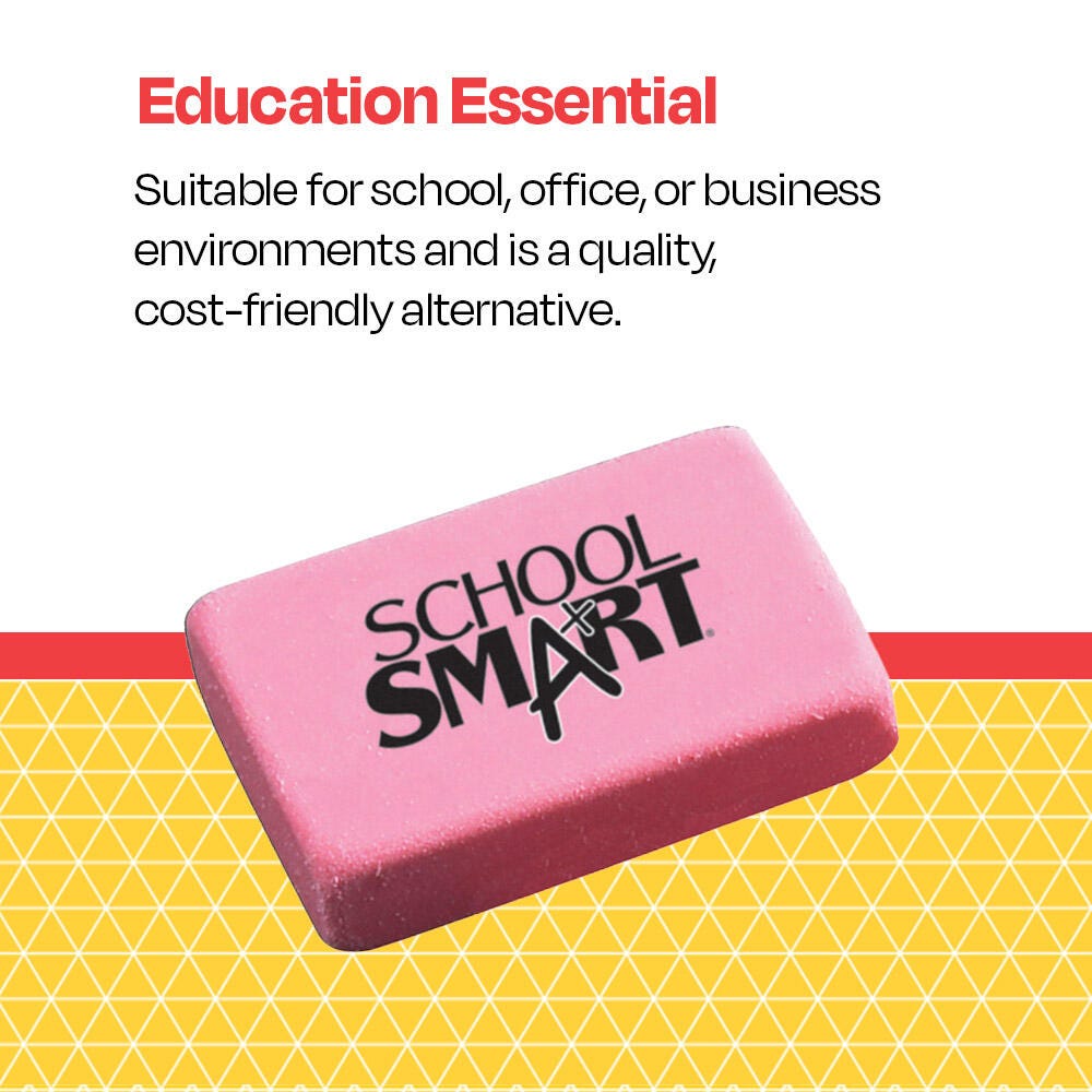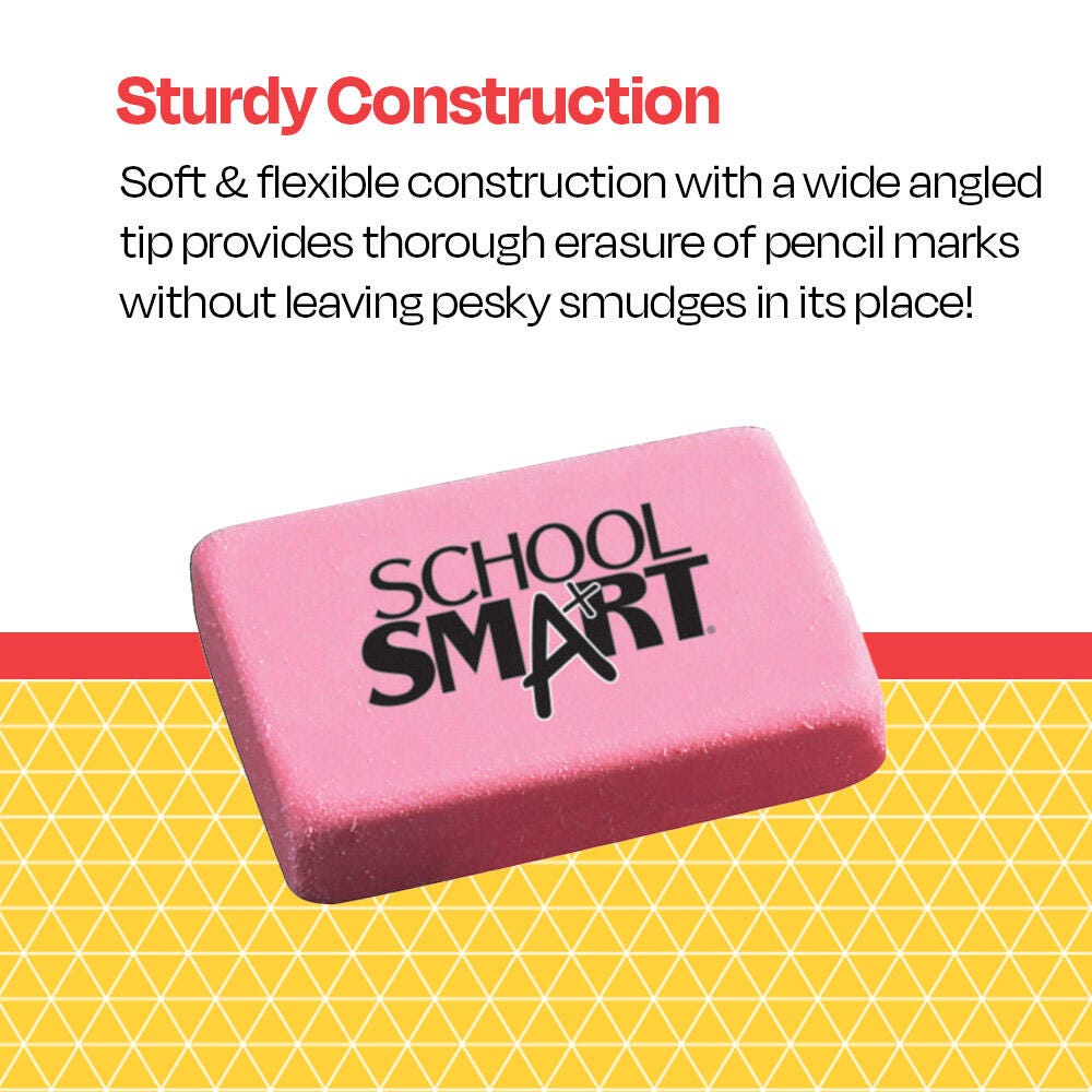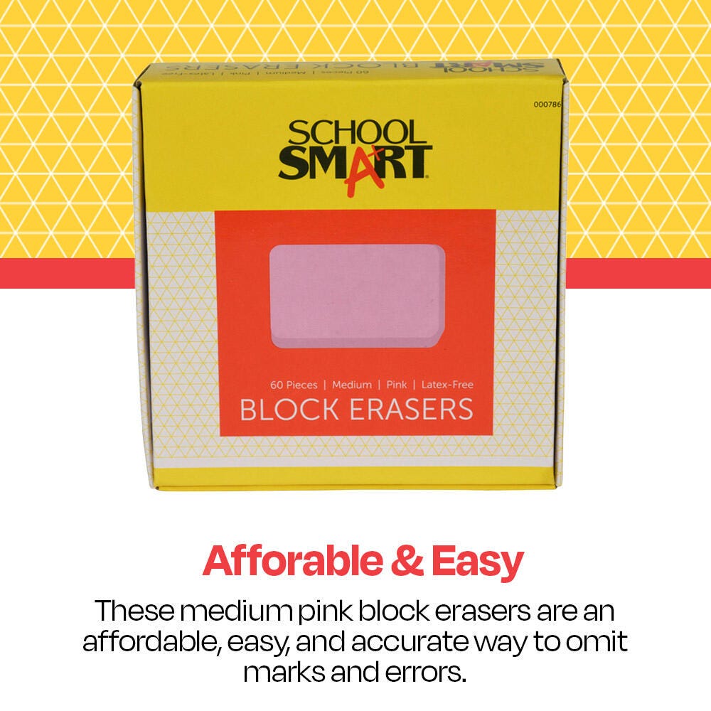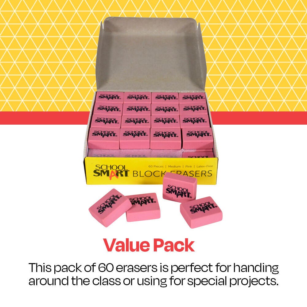 School Smart Block Erasers offer smudge-free results for clean and complete writing or drawing omissions. Each of these soft pink erasers is bendable and has rounded edges that make it easy to grip and hold while rubbing on the page. Erasers are made of synthetic rubber that does not easily apart in pieces. Each eraser measures 1-1/8 x 15/16 x 3/8 inches. Sold as 60 piece per pack. Latex-free.