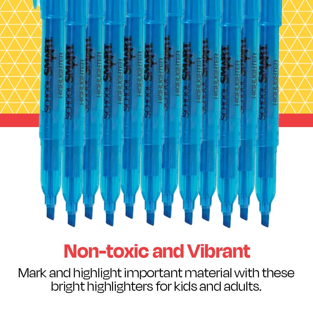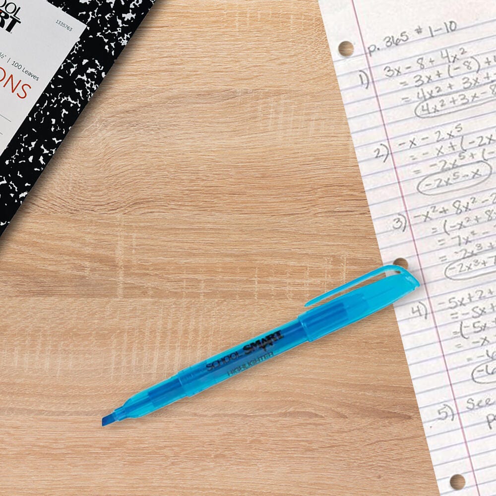 Mark up your notes and important information in books with the School Smart pen style highlighter pack in blue. Our fluorescent blue highlighters come in a thin design and chisel tips for wide or fine highlighting. The see-through ink is bright and noticeable. Use the narrow tip highlighter for organizing school, office, or personal notes.Features