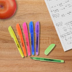 The colorful highlighters in the School Smart pen style highlighter pack make your notes “pop.” Our chisel tip highlighters in assorted colors are great for studying in elementary, middle, high school, and college. Teachers and professors love them, too! This fun fluorescent highlighters set comes in a thin design and chisel tips for wide or fine highlighting. The see-through ink is bright and noticeable wherever you use it. Narrow tip highlighters are great for organizing school, office, or personal notes. The pen-style body makes this the best highlighter for a firm grip and more accurate application.Features