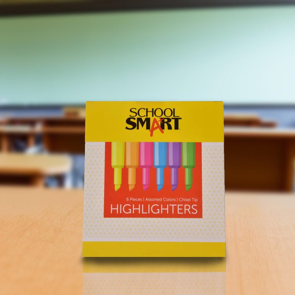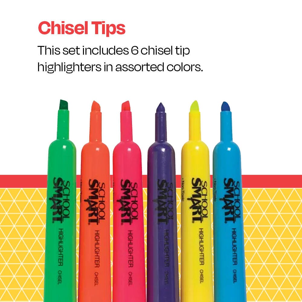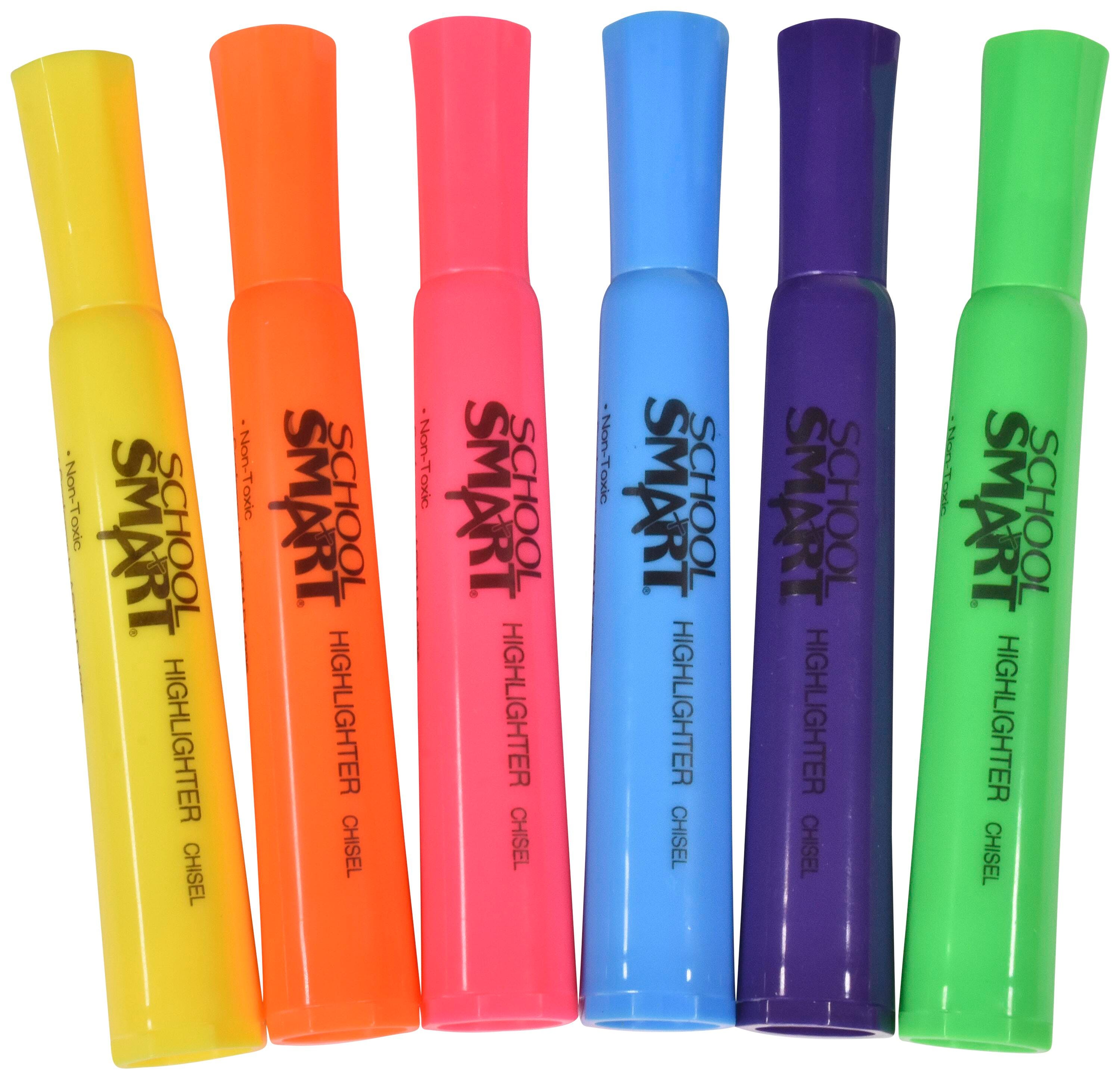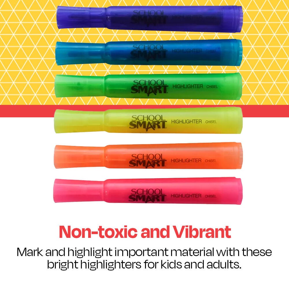 Stock up and save with the School Smart neon assorted colors highlighters set. Our non-toxic tank highlighters are comfortable to hold and have a broad line tip for more highlighting options. Students, teachers, and office professionals love the easy-to-hold large barrel. The chisel tip highlighters allow for wide or fine highlighting, while the see-through ink is bright and noticeable. This pack of 6 includes 1 highlighter in each of the following colors: yellow, pink, orange, green, blue, and purple.