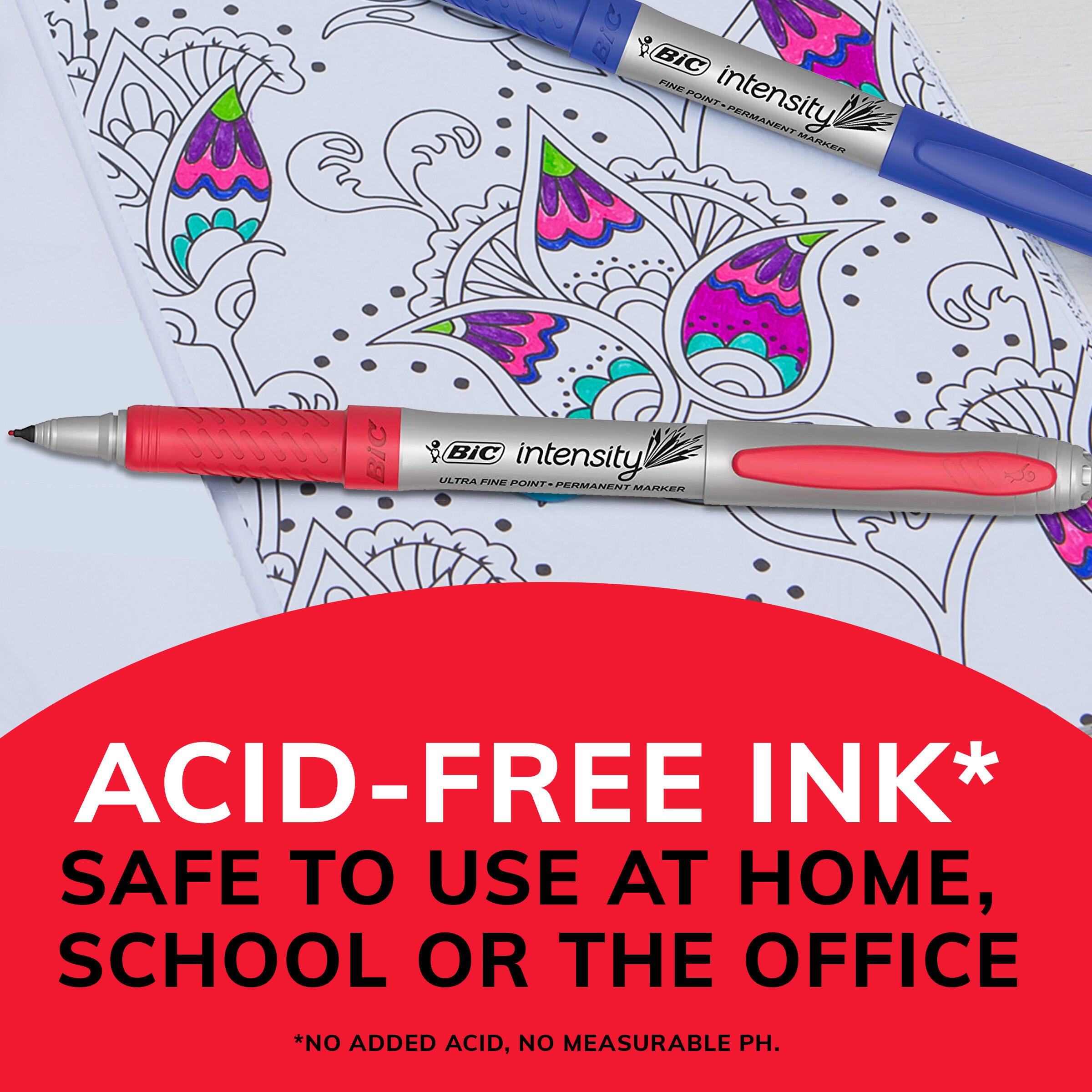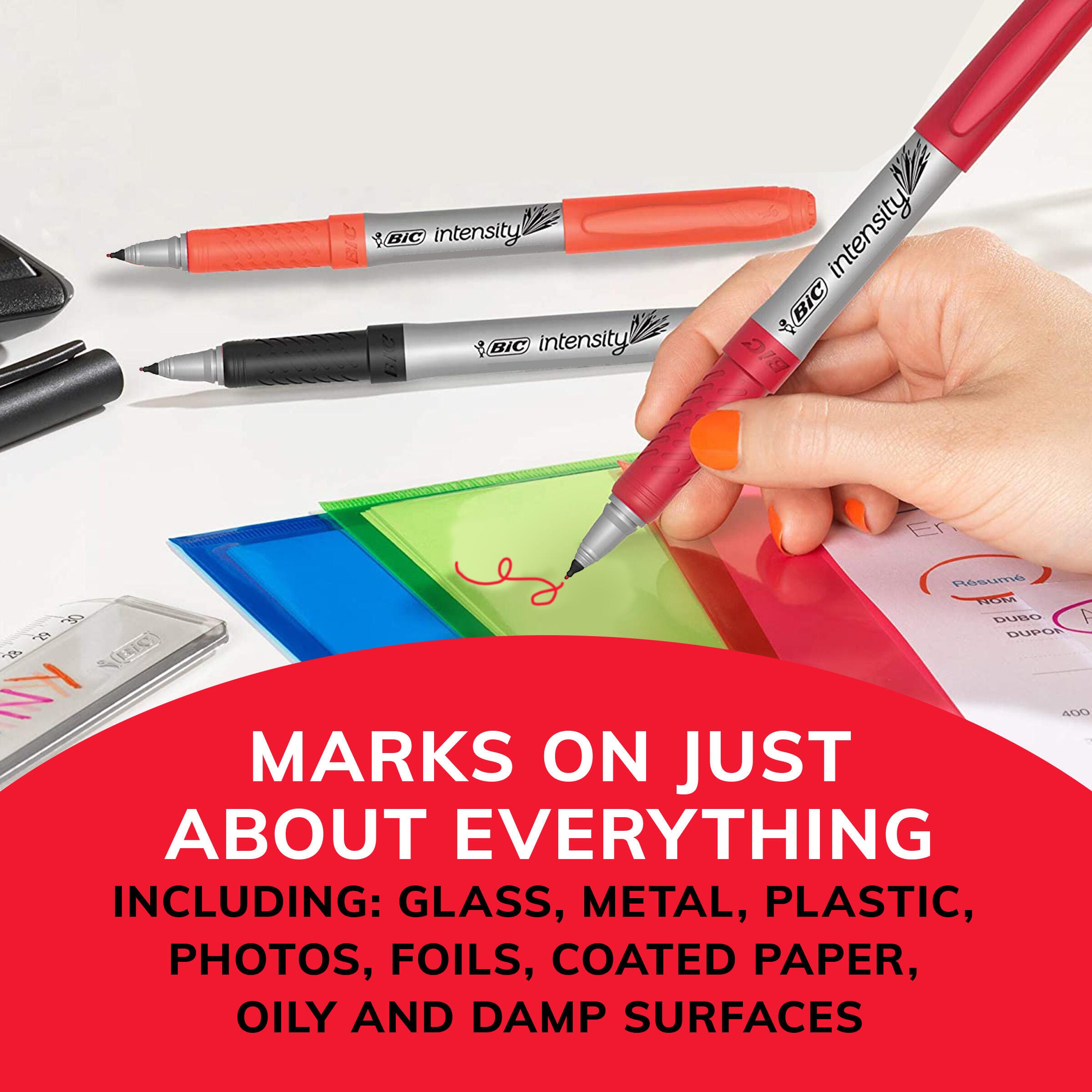 These BIC Intensity Permanent Markers provide bold permanent ink for creative and DIY projects in the classroom, office, or home. A rugged ultra-fine tip with extended cap-off-time offers extra durability. The pen-style barrel and textured grip provide lasting comfort during longer projects. The acid-free ink ensures permanent marks on photos, glass, coated papers, CDs, plastic, and regular paper for versatile use in a variety of projects. This set contains 12 black permanent markers.