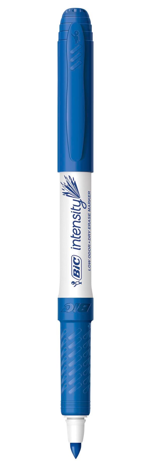 BIC Intensity Low Odor Dry Erase Fine Tip Markers bring your ideas to life in bold, easy-to-erase ink. These dry-erase markers feature an ergonomic barrel with a rubberized grip for enhanced writing comfort and control. They feature blue ink that is low-odor and nontoxic, excellent for brainstorming and presenting in classrooms and offices. Each marker features a fine tip that delivers consistent, thin lines that are great for detailed writing and drawing. The high-quality ink wipes away with minimal smudging and smearing on whiteboards, glass, and other non-porous surfaces. This pack contains 12 blue dry-erase markers.