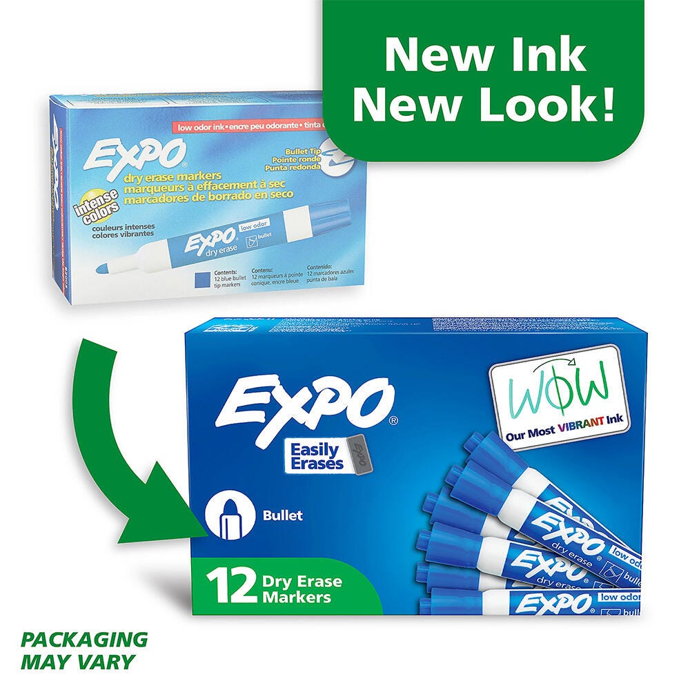 These EXPO Low Odor Dry Erase Markers are ideal for whiteboard projects like presentations, schedules, displays, and more in the classroom, office, or home. Each marker boasts a sturdy bullet tip that lays down thick, distinct markings and specially formulated, premium ink that erases easily from most nonporous surfaces, has virtually no odor, and is bold enough to see from a distance.