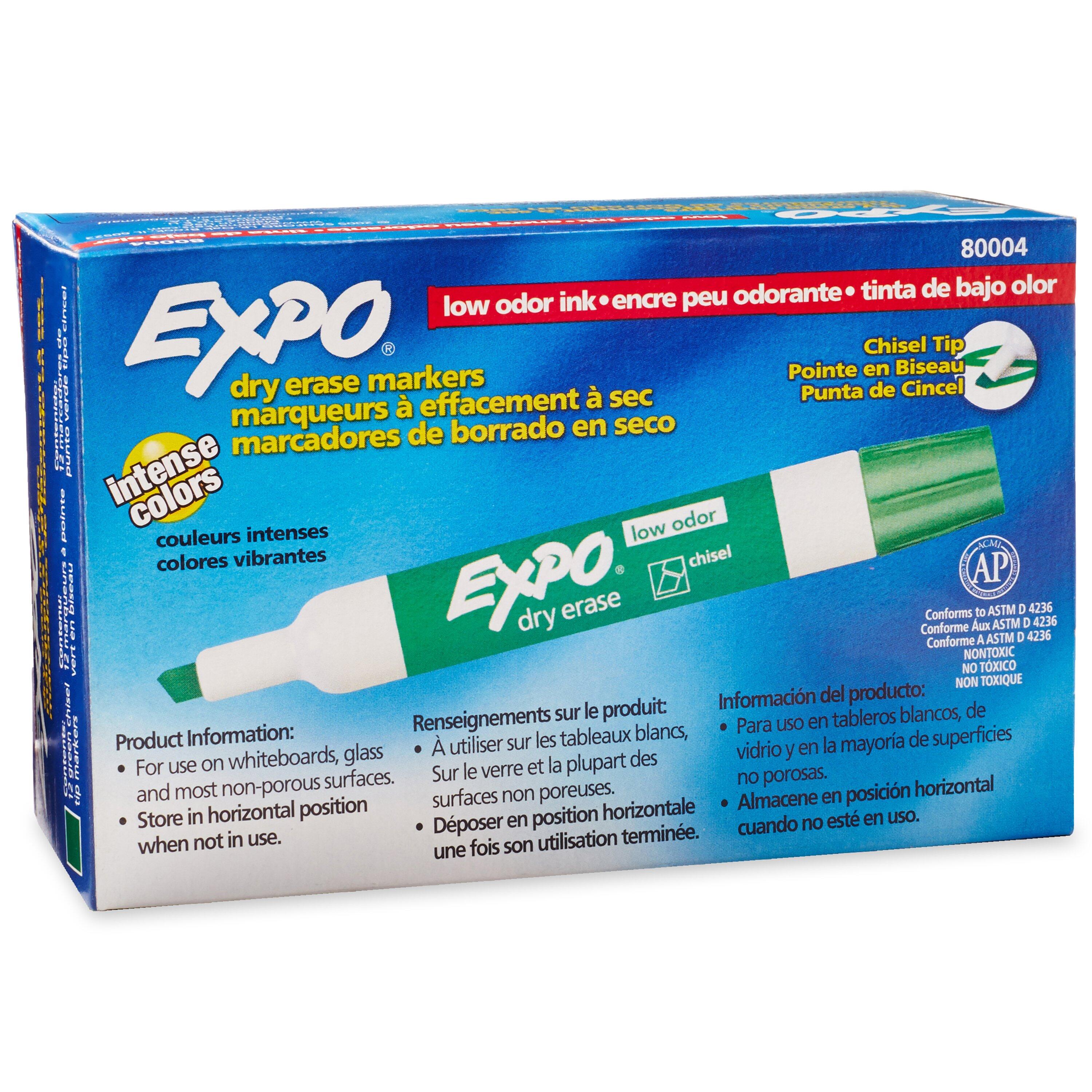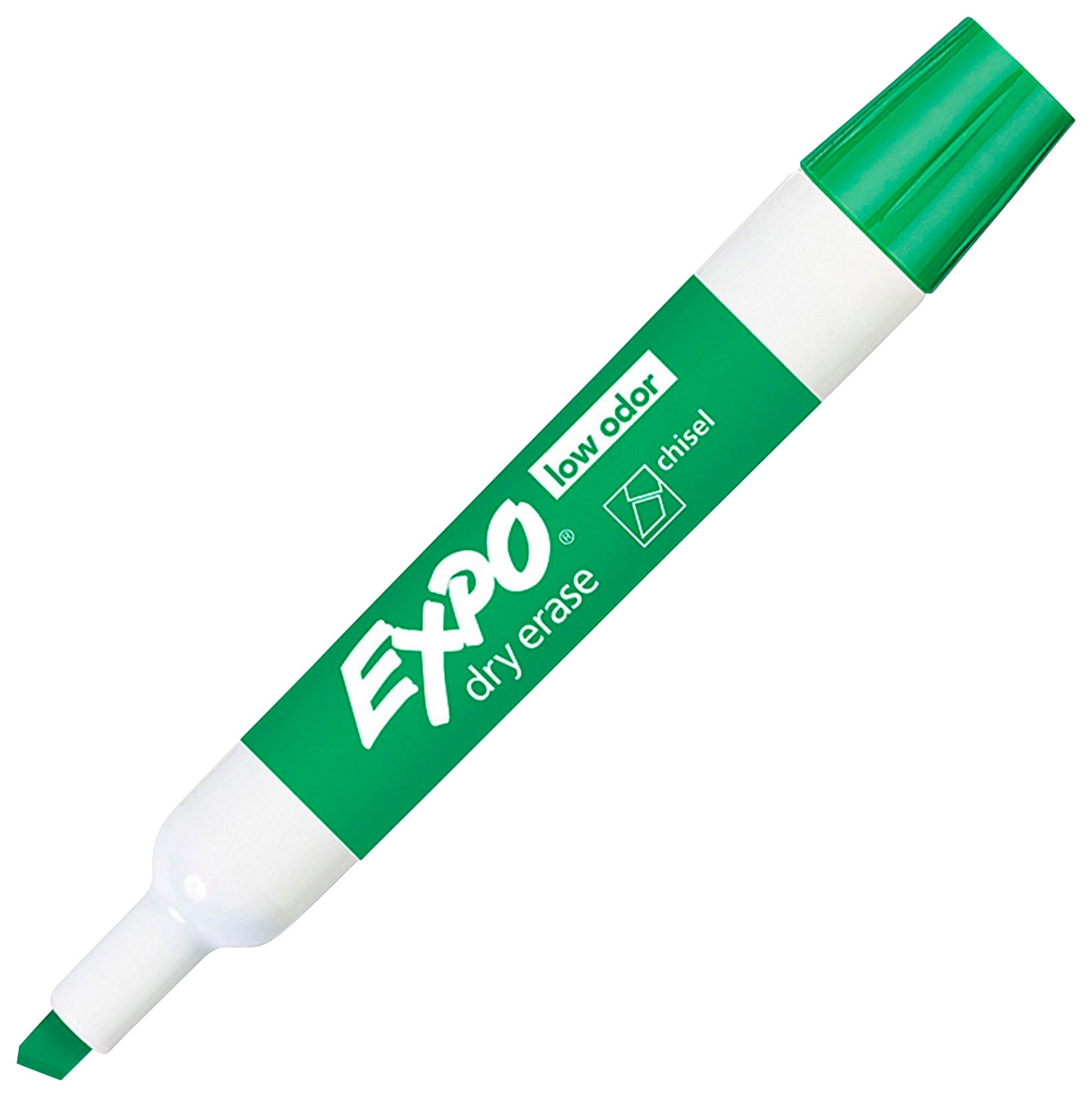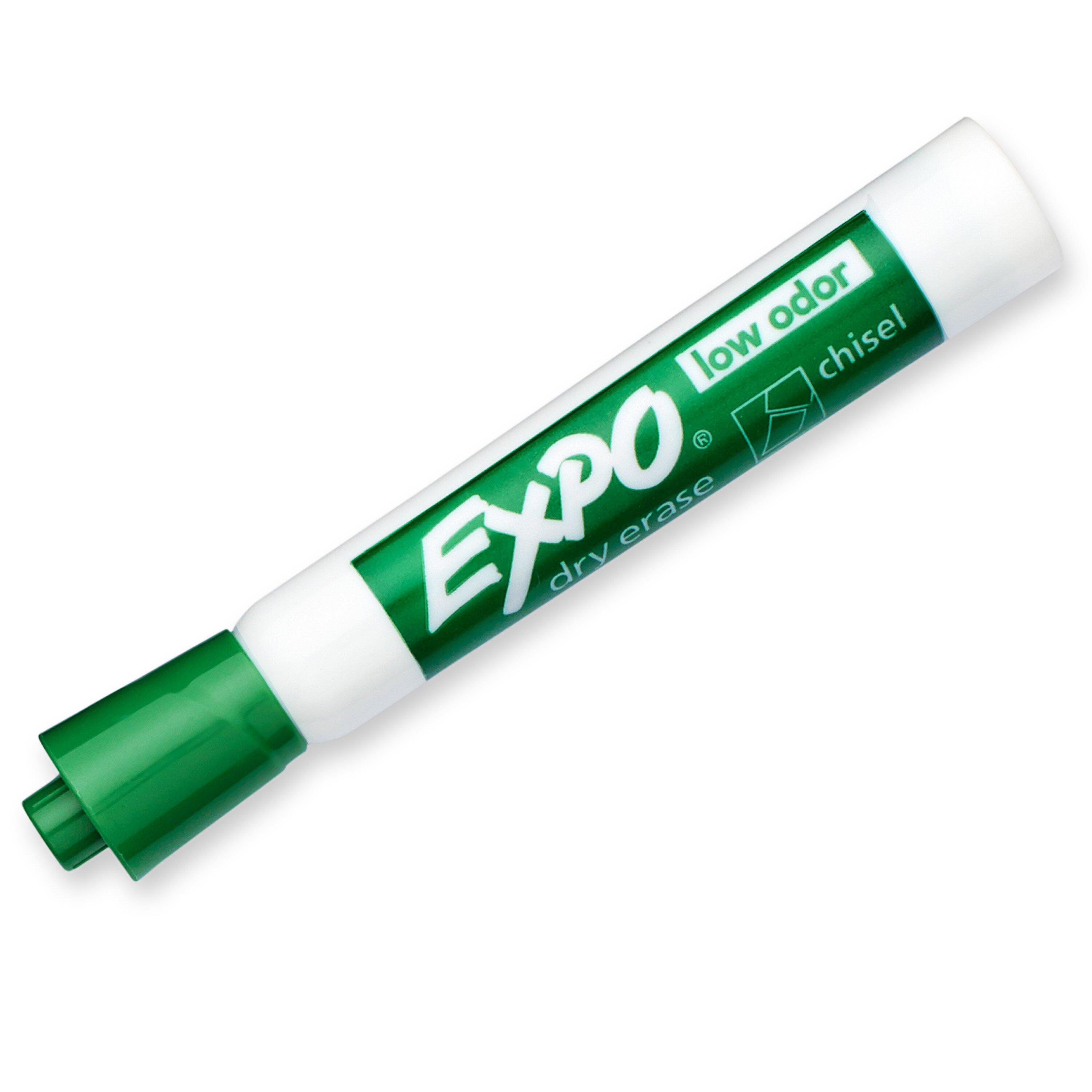 The Low Odor Dry Erase Markers from EXPO each have a chisel tip that allows for broad, medium, and fine lines and markings. The specially formulated ink erases easily from most nonporous surfaces, has virtually no odor, and is bold enough to see from a distance. EXPO markers are ideal for whiteboard projects like presentations, schedules, displays, and more in the classroom, office, or home.