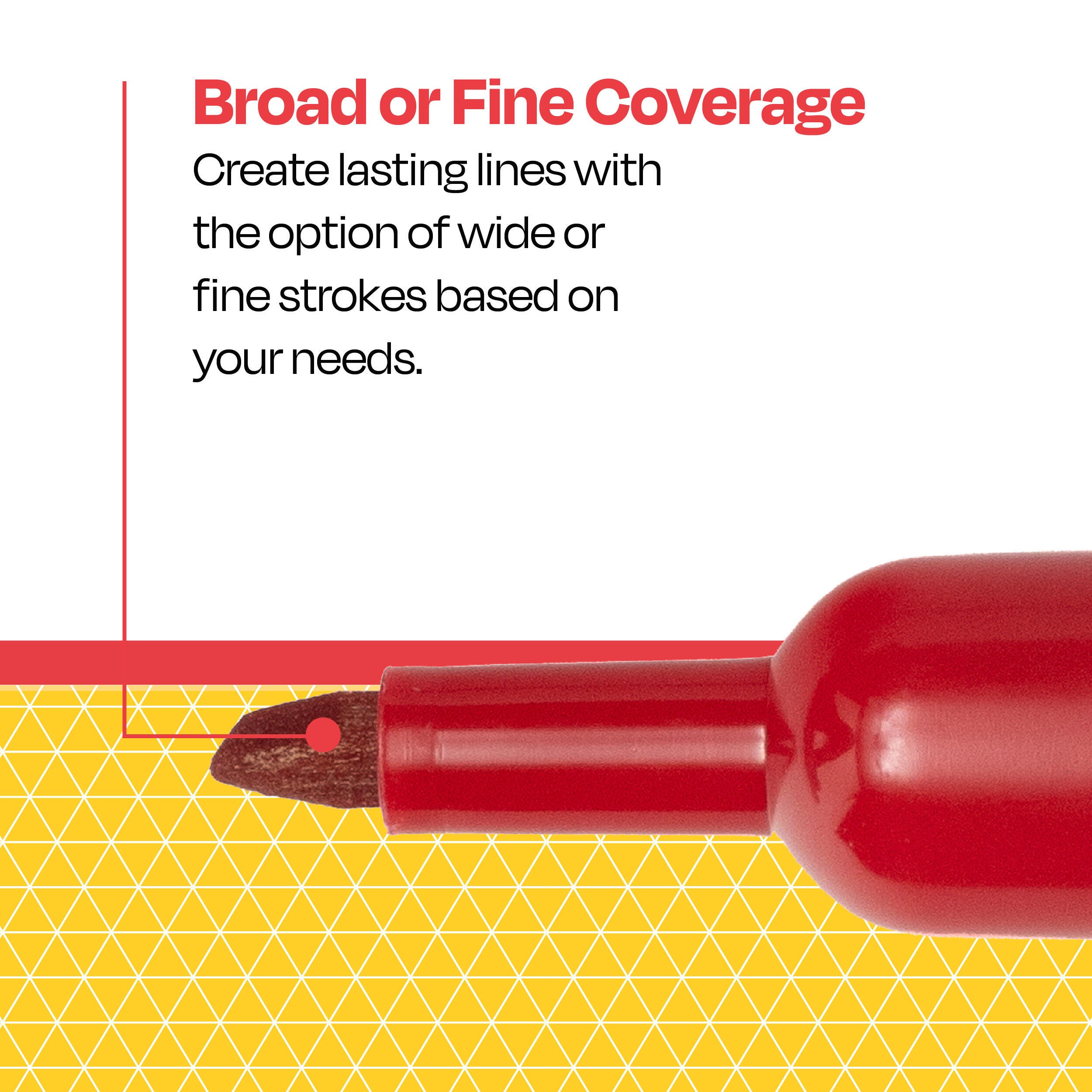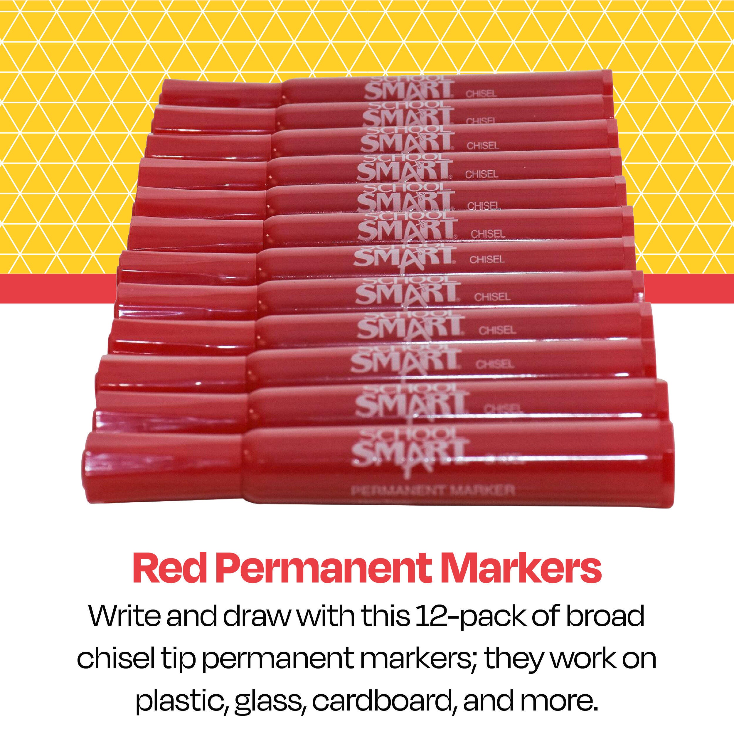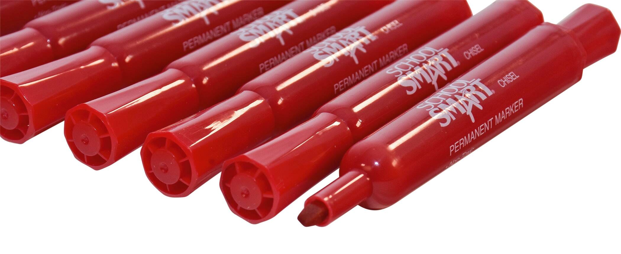 School Smart non-toxic permanent markers come in a red color and broad chisel tip design. Our chisel tip markers provide a wide range of coverage and can be used to create fine lines or wide strokes. The non-toxic red marker writes on most surfaces and is great for school, office, and home use.