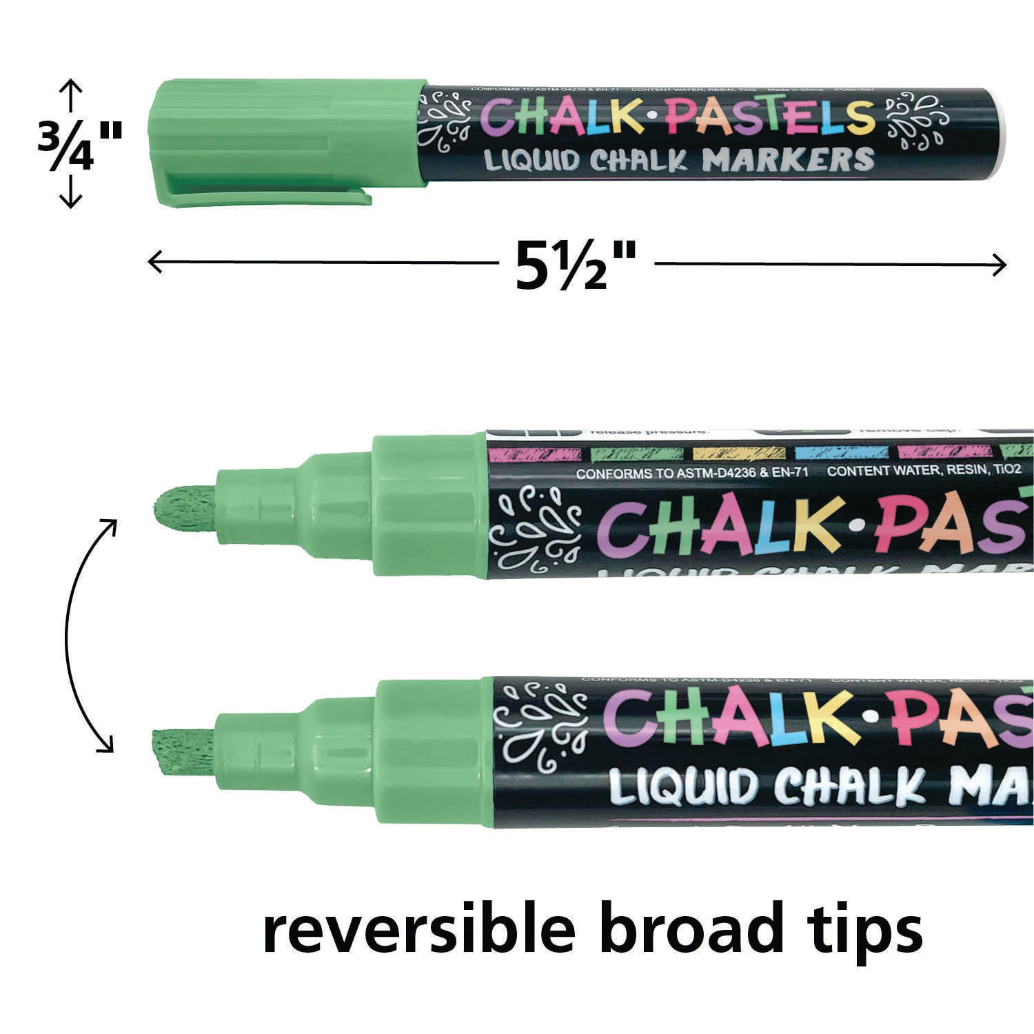Get creative and colorful with these Chalk Brights Liquid Chalk Markers from Teacher Created Resources! These versatile markers boast unique reversible tips, with a bullet tip on one end and a chisel tip for drawing thick or thin lines. They are water-based, non-toxic, and wet-erase for easy cleaning. Just wipe with water to change up your art! These markers are suitable for use on all non-porous surfaces. Includes 8 markers. Recommended for ages 3 and up. Contains water, resin, and titanium dioxide (TiO2). This set of eight contains 8 markers, with one of each of the following pastel colors: red, pink, yellow, green, blue, purple, orange, and white.Features