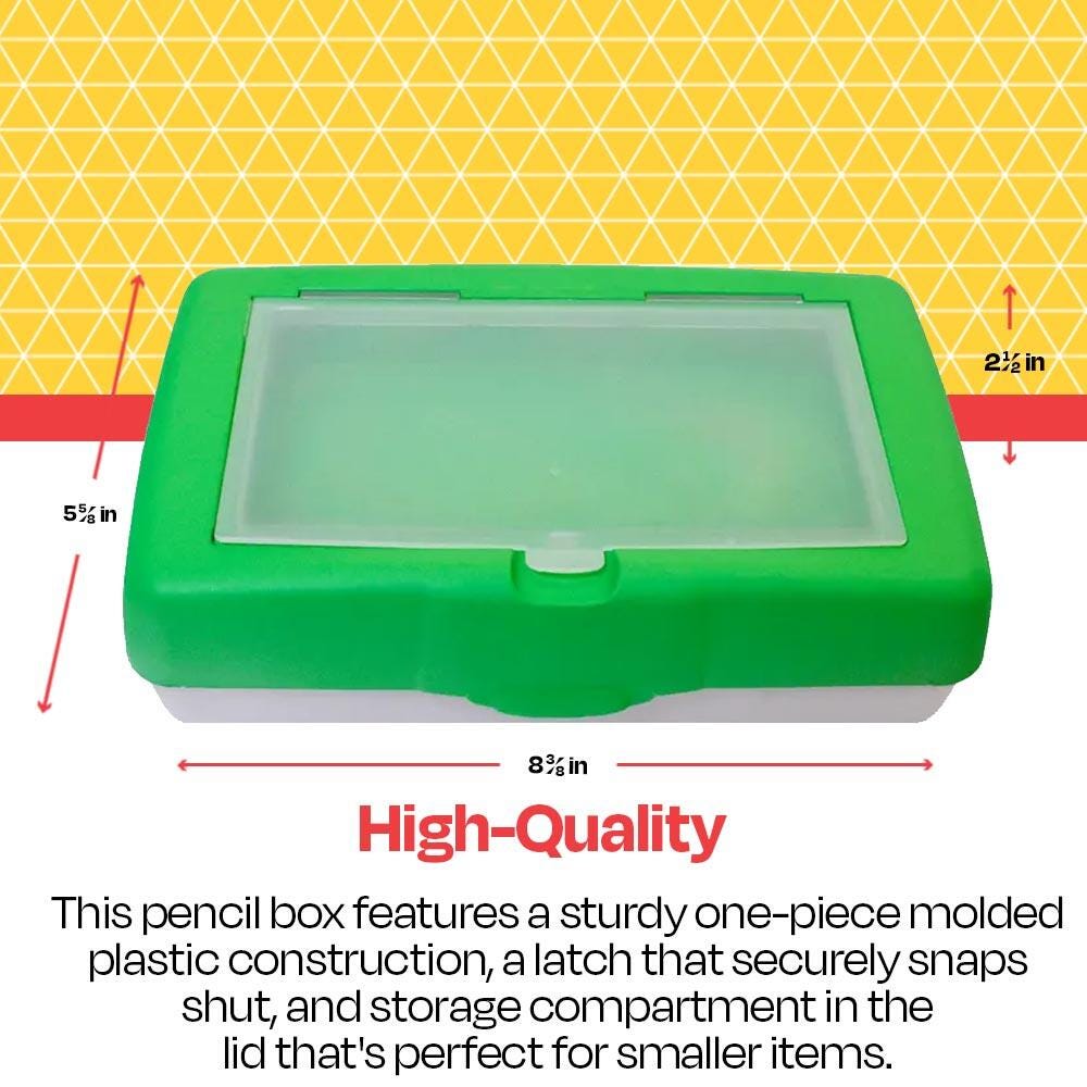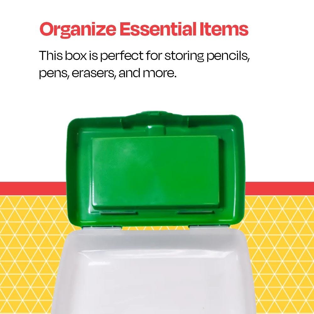 Stay organized with the School Smart plastic pencil box. Unlike regular pencil cases, this 2 layer design includes separate compartments for a better storage system. Our green pencil box is made of hard plastic with a solid one-piece construction using advanced plastic molding techniques. This pencil box features a lid that snaps shut with an integrated latch and hinge. Use the pencil case for organizing and storing different arts and crafts supplies, colored pencils, markers, crayons, glitter glue, and more. Create your best storage system for classrooms with School Smart organizers and storage bins.