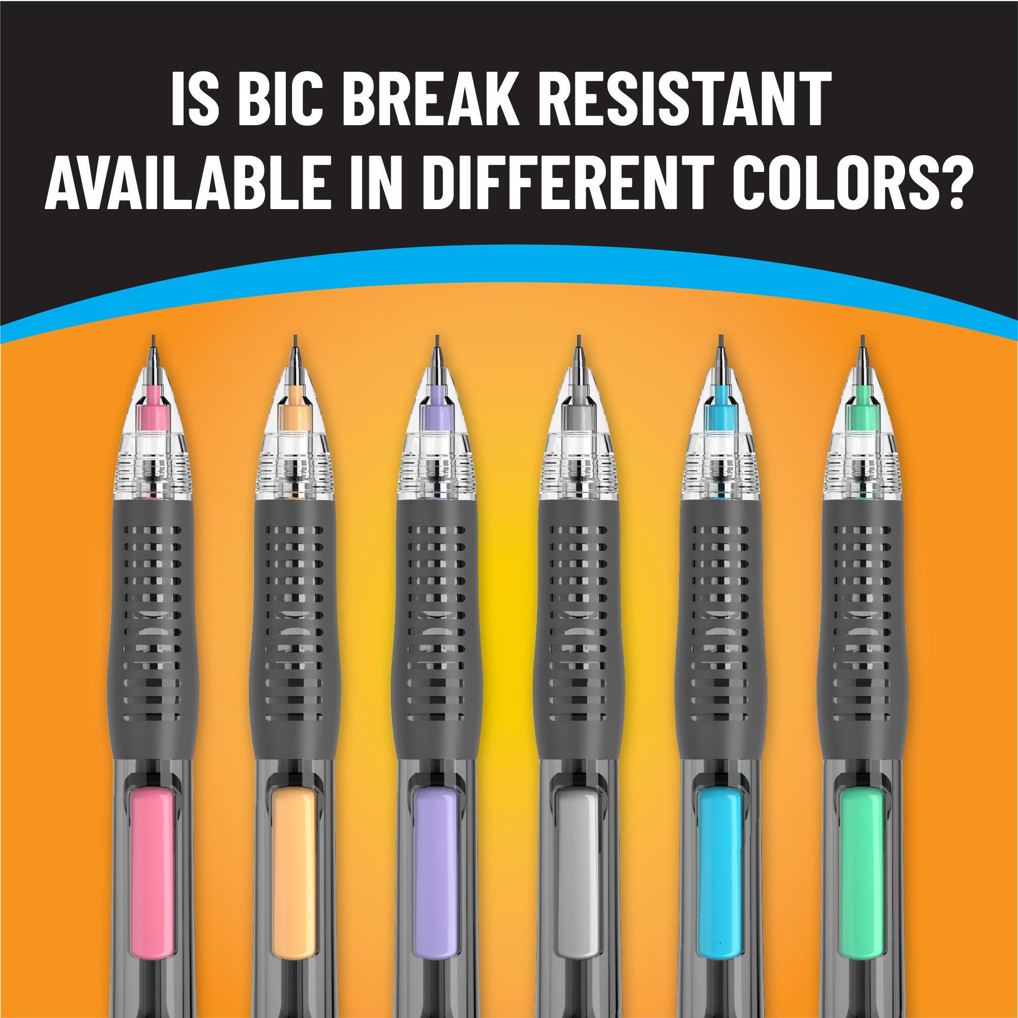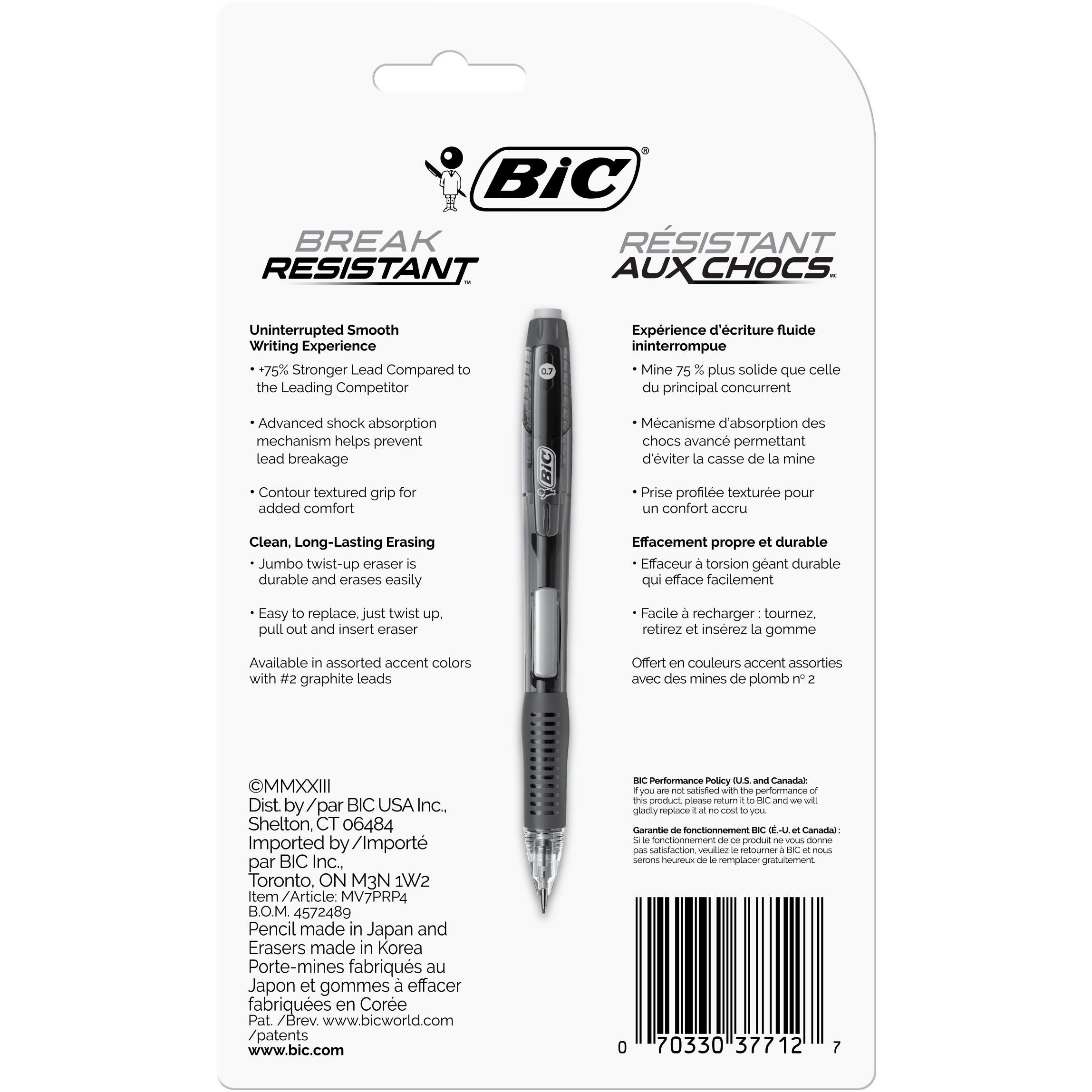 No more broken leads! BIC Break-Resistant Mechanical Pencil has 75 percent stronger lead* (*vs leading competitors) and an innovative shock-absorption mechanism that helps prevent lead breakage. A jumbo-size eraser makes clean corrections easier than ever with a simple twist-up design and marks that won't smudge the page. This pack of 4 mechanical pencils each feature a medium 0.7 mm lead tip.