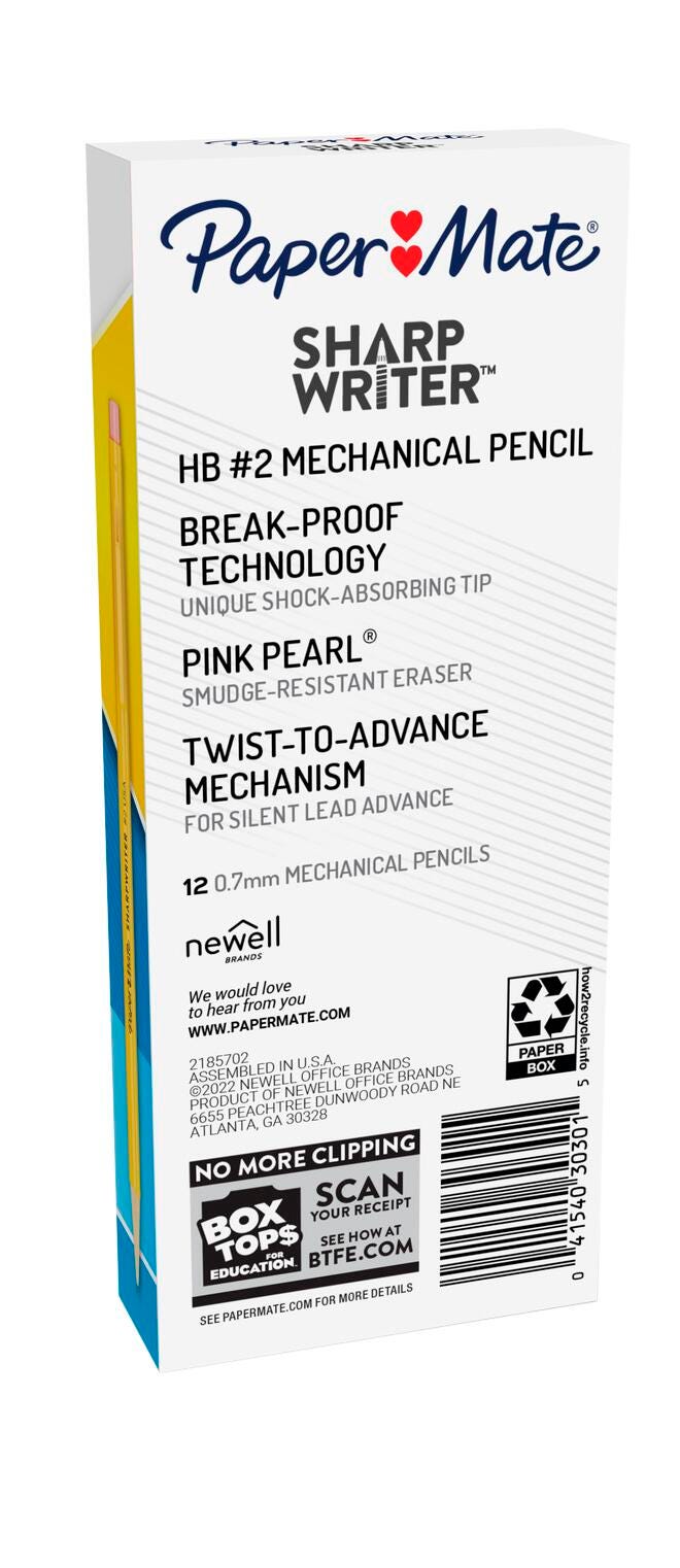 Choose Paper Mate Sharpwriter Mechanical Pencils for break-free writing in the classroom, home, or office. The reliable mechanical pencils reduce lead breakage with a unique shock-absorbing tip and improved break-proof technology. These pencils are also equipped with a smudge-resistant Pink Pearl eraser and a unique twist-to-advance system for effortless lead dispensing. This pack includes 12 mechanical pencils.