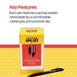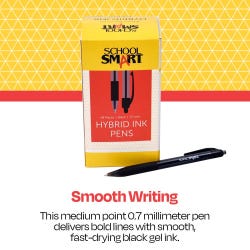School Smart black gel and ink pens have a hybrid design to give you the best writing experience. The retractable pens offer high-performance ink technology and a quick dry all in one convenient, comfortable design. Smear-proof and smudge-proof liquid gel ink dries rapidly, allowing you to close up notebooks or seal up letters instantly without worry. A medium-sized nib is 0.7 mm to allow for all-purpose writing. The spring-loaded ink cartridge retracts and extends outside a protective housing, and the clear barrel allows you to see exactly how much ink is left. Choose our hybrid gel ink pens for all of your writing needs.Features