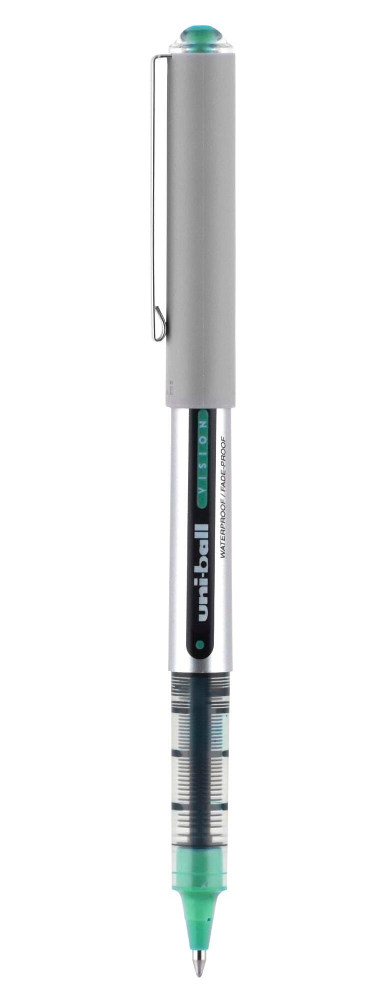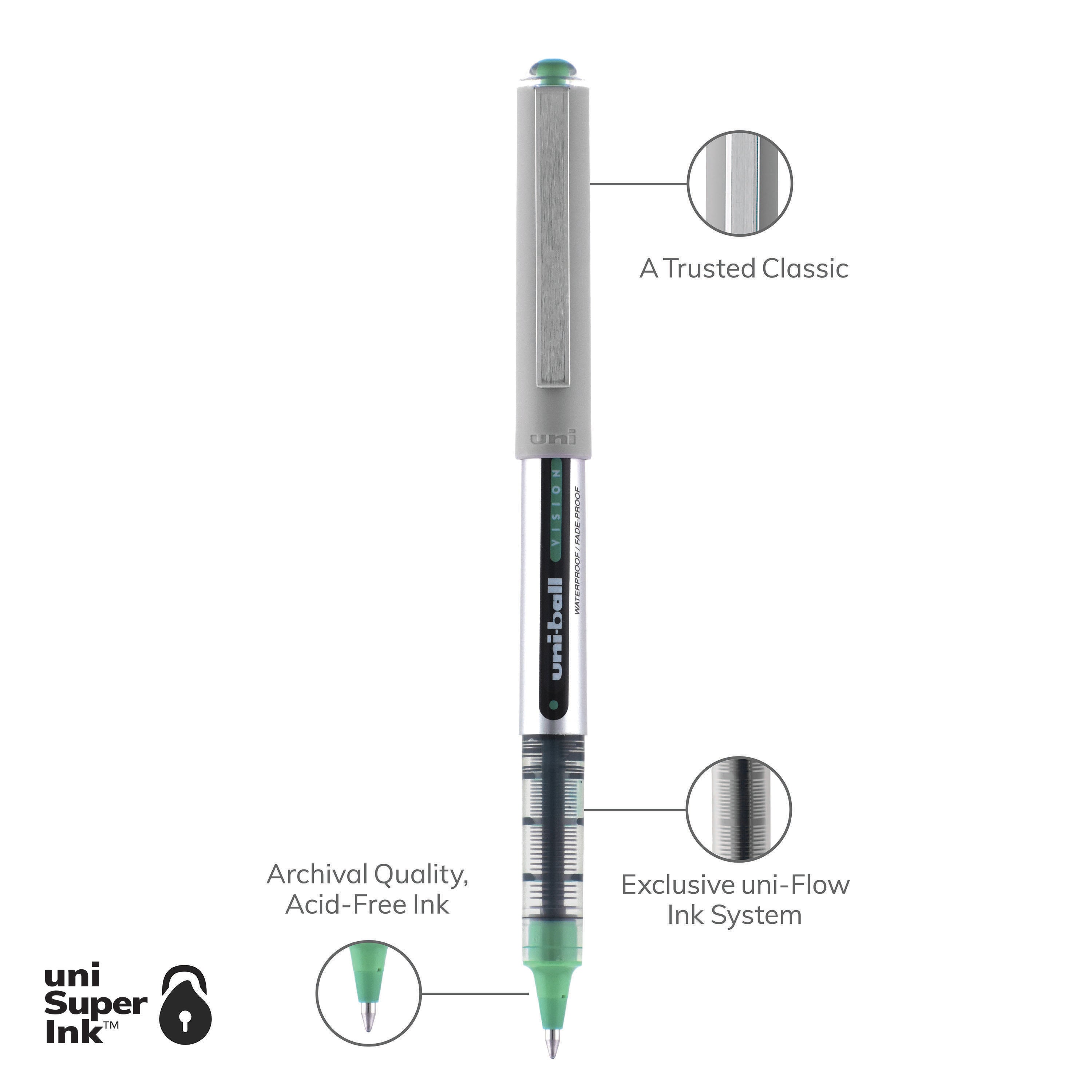 The rollerball pen has free flowing and fluid ink, similar to a fountain pen. You can actually feel the ball contacting the paper and see the ink flowing out of the pen as you write. Each roller pen features waterproof uni Super Ink which protects against water, fading, and fraud. Archival quality and acid free ink is great for documenting and record keeping. The larger particles deliver solid vivid colors every time you write.