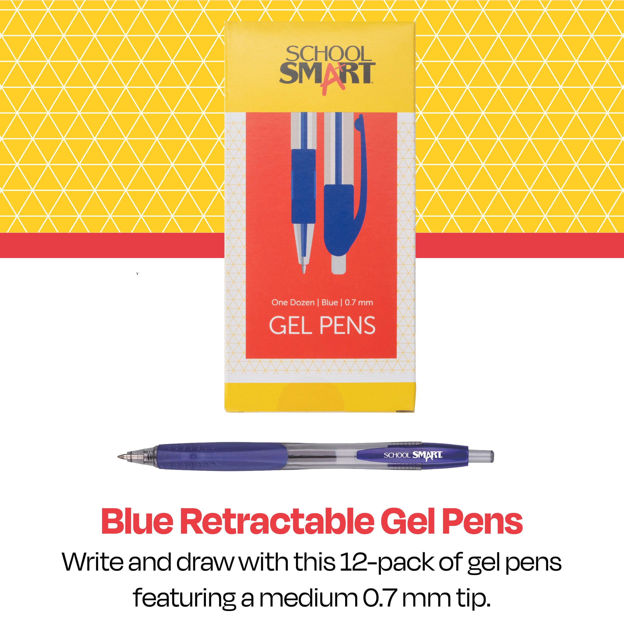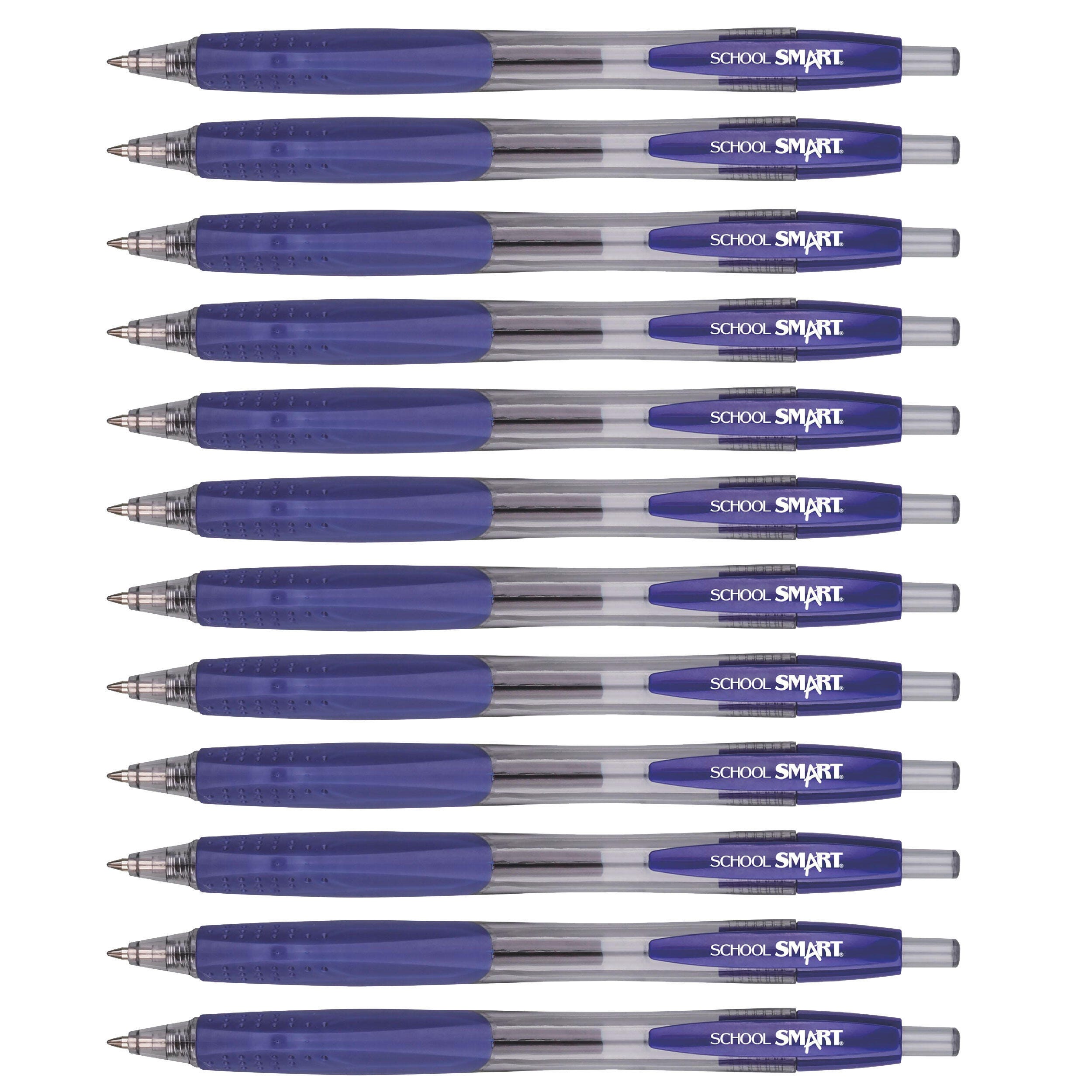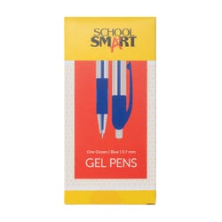 School Smart retractable gel pens provide effortless writing and added comfort with a tungsten carbide ball tip and smooth, supple rubber grip. The medium-sized nib is 0.7 mm for all-purpose writing. A spring-loaded ink cartridge retracts and extends outside its protective housing while the clear barrel allows you to see exactly how much ink is left. The value pack of 12 blue pens lets you keep them in various locations or on hand for sharing in the office or classroom.Features