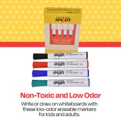 School Smart assorted color dry erase markers are great for teachers, students, and office professionals. Use the low odor dry wipe marker pens for group lessons, problem-solving, daily schedule displays, and more. Convenient chisel tips allow for fine line or broad strokes when needed. Our whiteboard pens are easily erasable while providing smooth ink flow. This assorted color marker set produces rich, solid, and bright colors on whiteboards, glass, and other non-porous surfaces.Features