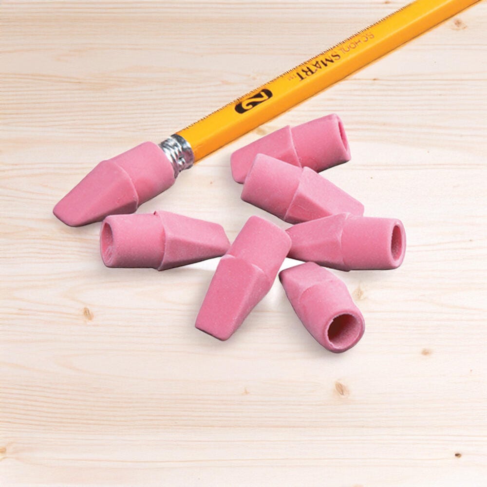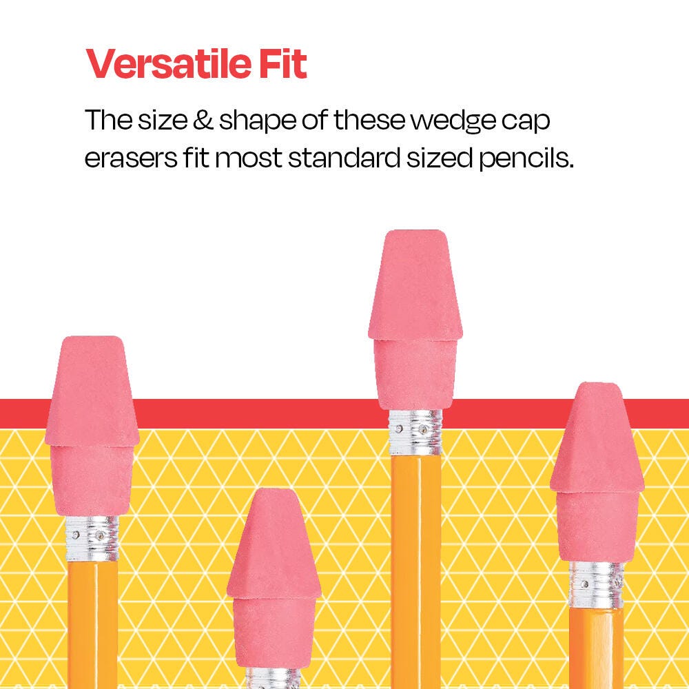 These handy Wedge Cap Pencil Tip Erasers from School Smart are designed to fit all pencils with a standard diameter. They are are excellent to replace worn-out erasers to extend the life of a pencil, or for convenient erasing on pencils without erasers. These reliable eraser caps easily wipe away mistakes and pencil marks without damage or smudging. Each eraser cap is soft, chisel-shaped, and latex-free. This pack contains 144 eraser caps to stock your classroom, office, or home.