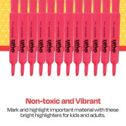 Mark up your notes in style with School Smart neon pink highlighters. Our tank highlighters are comfortable to hold and have a broad line tip for more highlighting options. Students, teachers, and office professionals love the easy-to-hold large barrel. The chisel tip highlighters allow for wide or fine highlighting while the see-through ink is bright and noticeable.Features