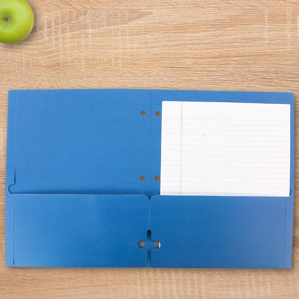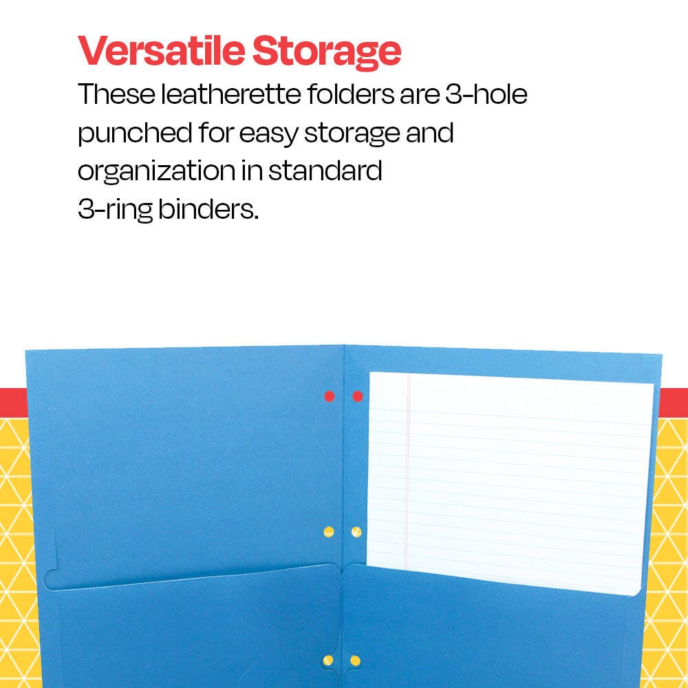The 2-Pocket Folders from School Smart hold up to 100 sheets to provide a versatile and reliable storage and organization solution for your classroom, office, or home! An embossed leatherette texture lends a stylish finish for professional, academic, and personal applications. The interior pockets are closed on 3 sides to ensure your papers stay securely in place, while double reinforced edges provide extra durability when opening and closing. These folders are 3-hole punched to fit into any standard three-ring binder and comfortably hold 8 1/2 x 11-inch sheets. This pack of 25 folders delivers quality and value for your storage needs.